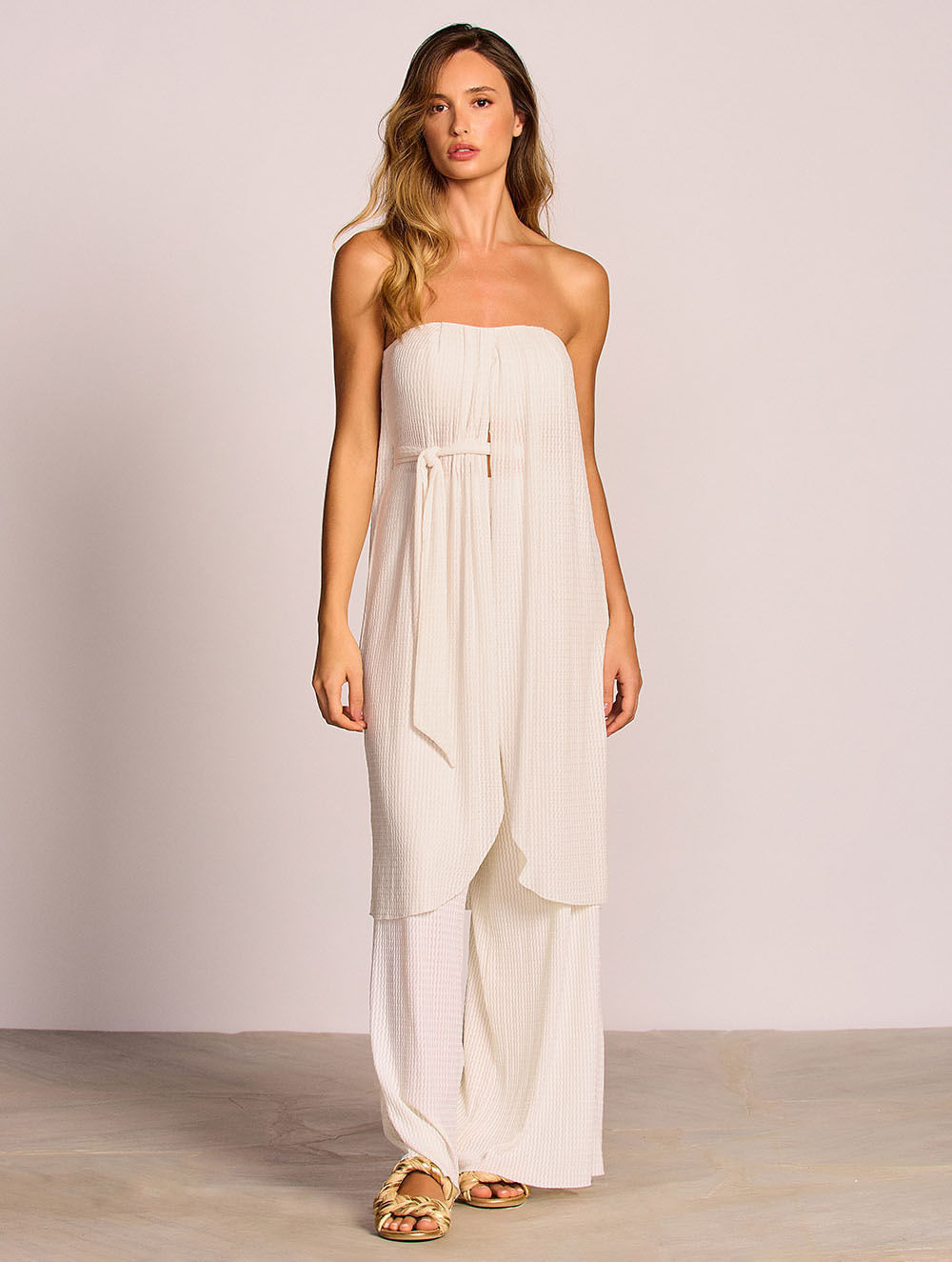 Bata lisa. O modelo é trabalhado em tecido com textura, possui decote reto, modelagem sem alças com ombros descobertos, silicone no decote para sustentação, pregas frontais e fenda. Acompanha faixa para amarração permitindo um shape acinturado.