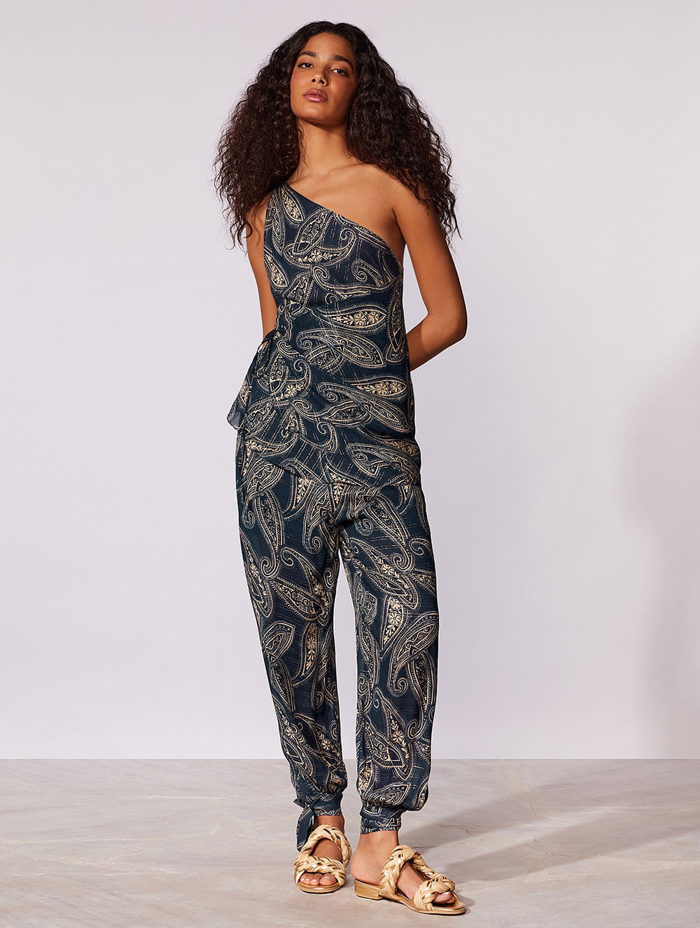 Blusa estampada. O modelo é trabalhado em tecido com fio de lurex, possui modelagem ombro único e detalhe de transpasse com amarração.