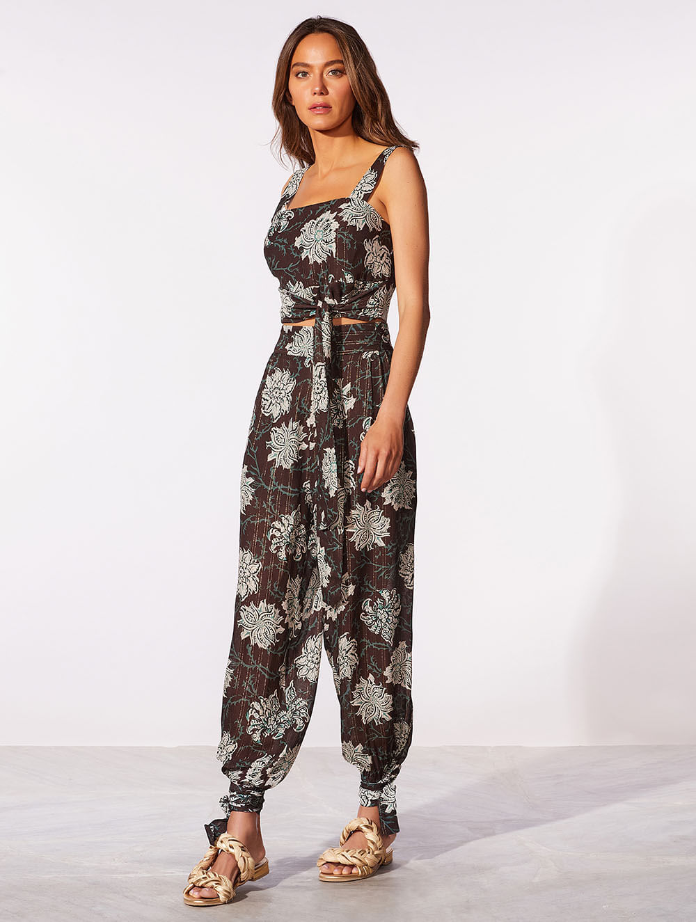 Calça aladim estampada. O modelo possui cintura alta, fecho de zíper invisível e detalhe de amarração no punho.