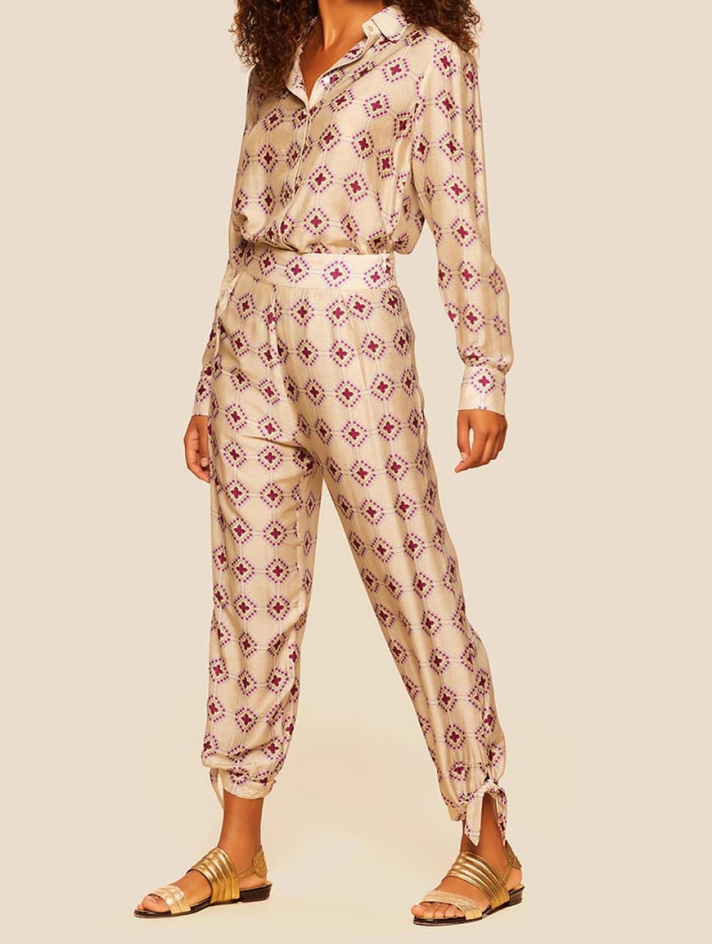 Calça em viscose com seda estampada. Possui zíper invisível na lateral e amarração na barra.
