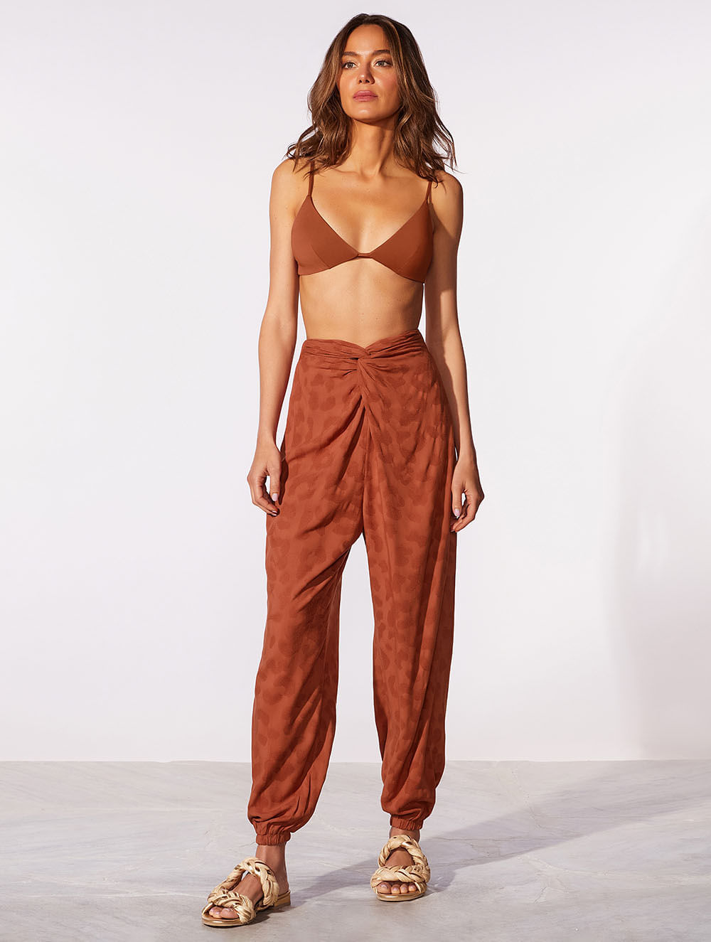 Calça jogger lisa. O modelo é trabalhado em tecido jacquard com textura, possui detalhe de nó no cós e punho de elástico na barra.