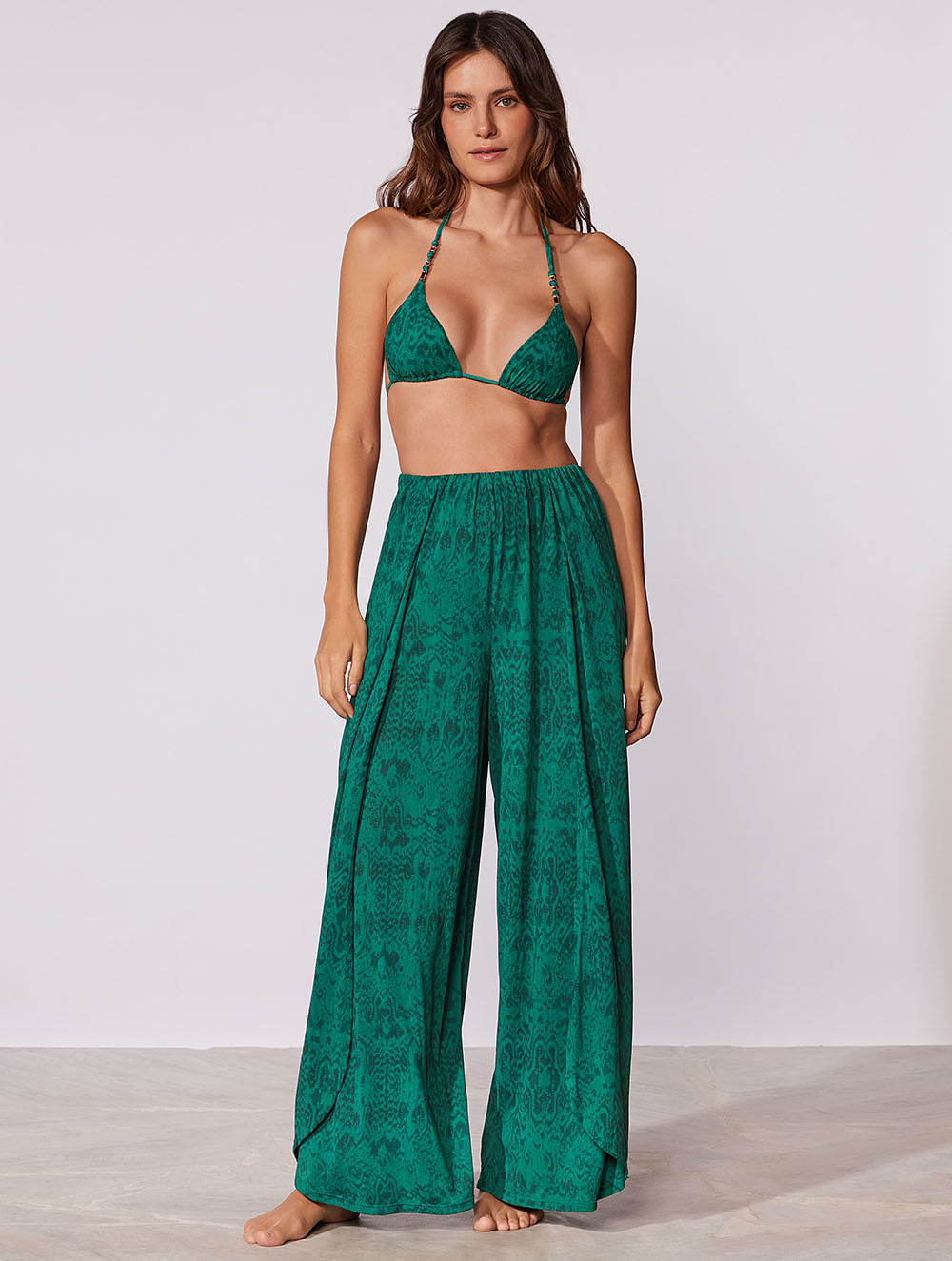 Calça pantalona estampada. O modelo possui modelagem fluida, elástico no cós e fendas laterais.