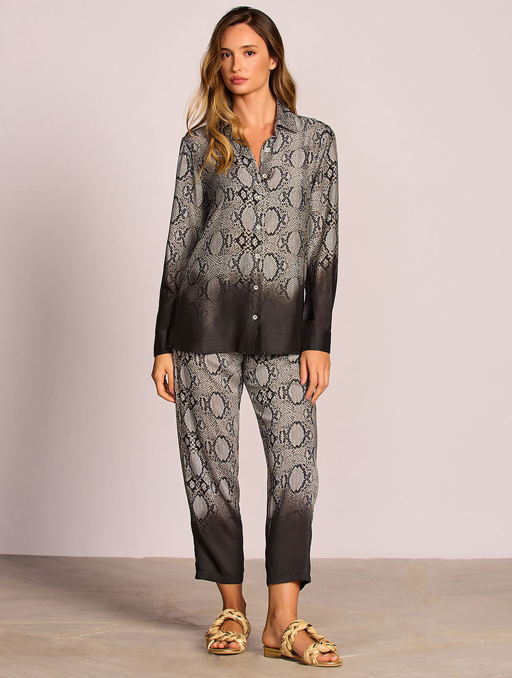 Camisa estampada. O modelo possui fechamento por botões frontal e nos punhos e estampa localizada com efeito dipdye no comprimento e mangas.