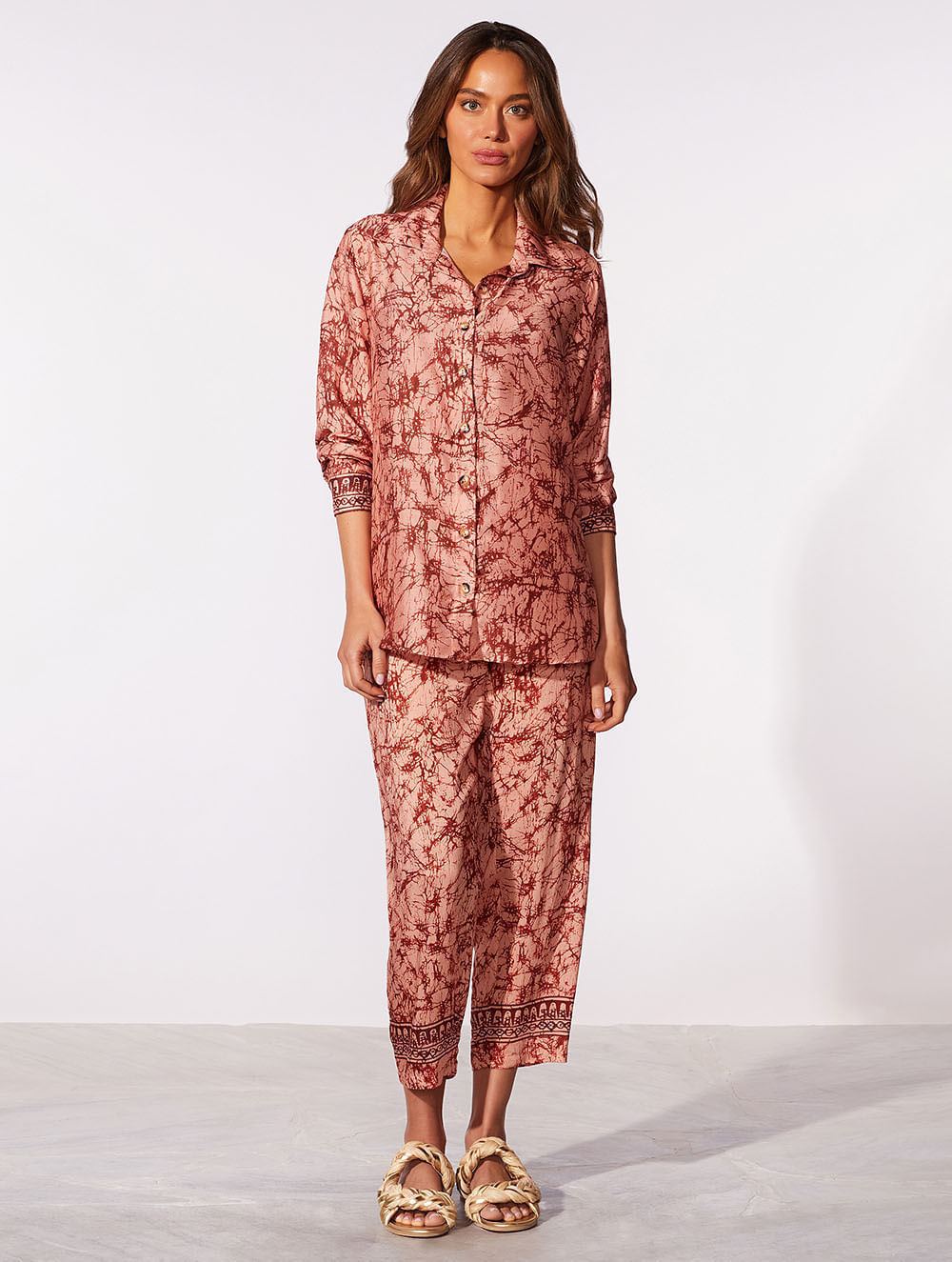 Camisa estampada. O modelo possui estampa localizada nos punhos, caimento leve e fluido, mangas longas e fechamento por botões na parte frontal e no punho da peça.