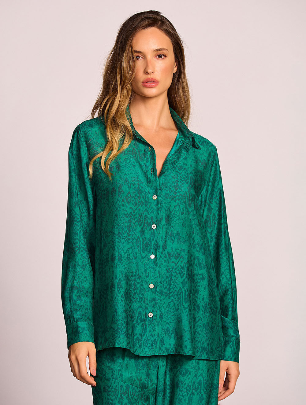 Camisa estampada. O modelo possui fechamento por botões na parte frontal e no punho da peça.