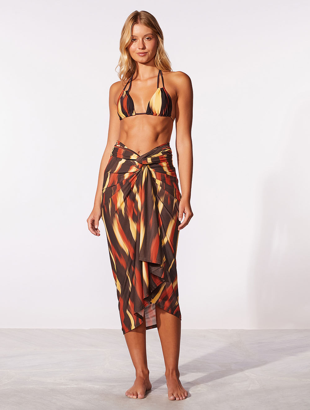 Canga estampada. O modelo pode ser usado de diversas formas no corpo ou apenas na cintura, garantindo versatilidade nas produções.