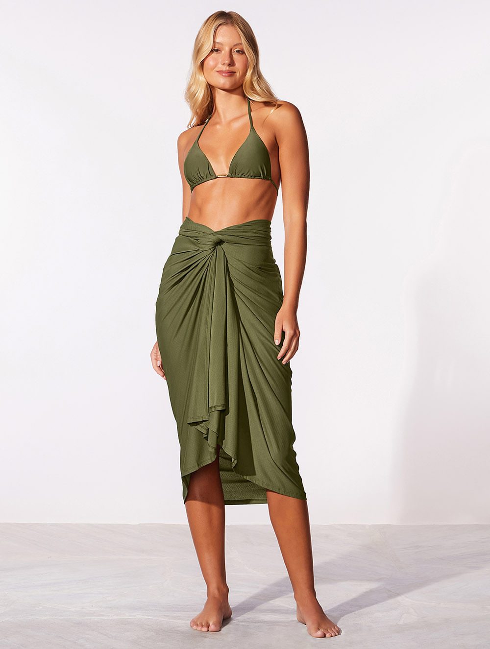 Canga lisa. O modelo pode ser usado de diversas formas no corpo ou apenas na cintura, garantindo versatilidade nas produções.