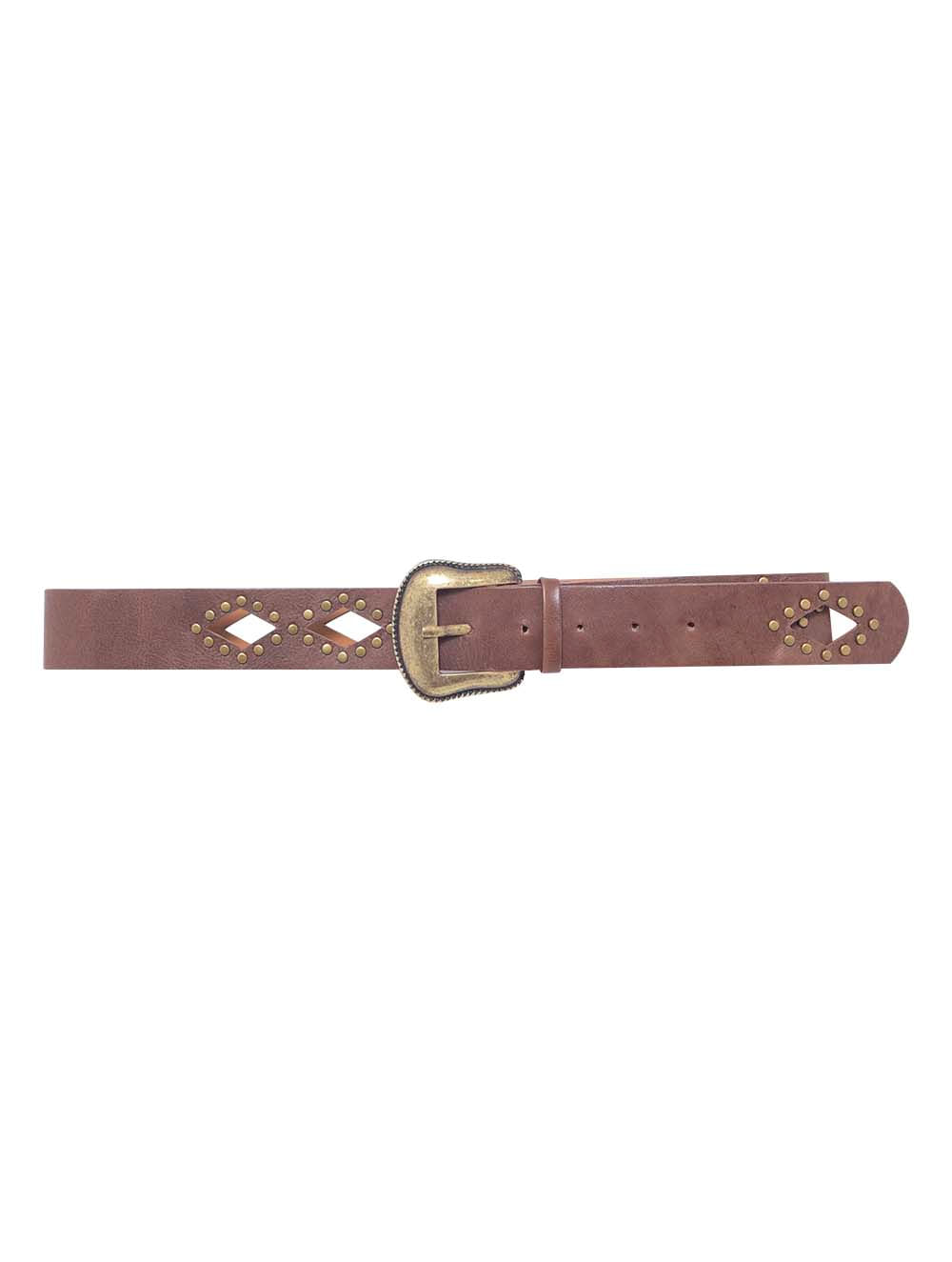 Cinto de couro. O modelo possui fivela em Ouro Velho, detalhes de recortes vazados e aplicação de tachas.