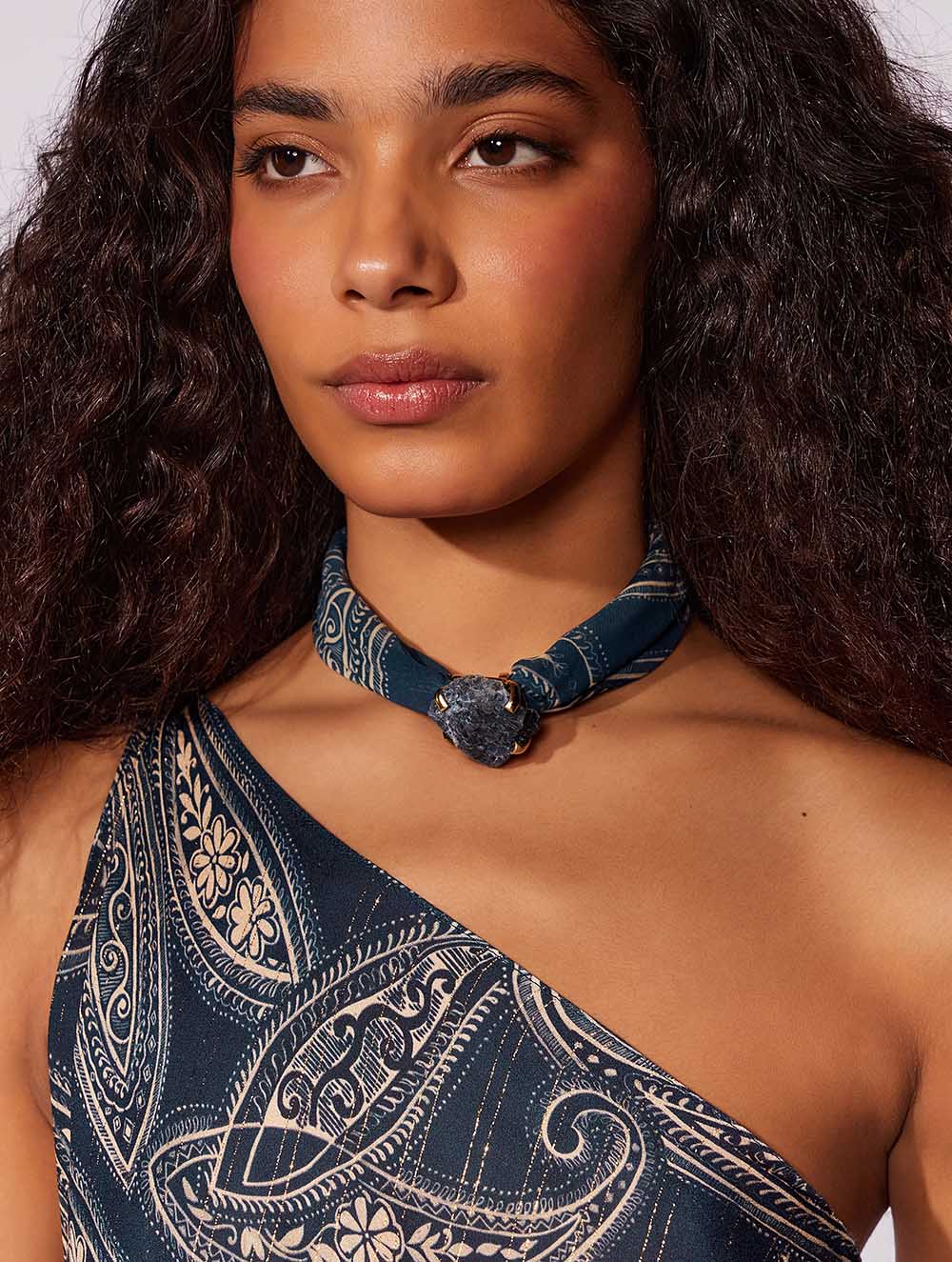 Colar lenço em tecido estampado. O modelo possui passante de pedra natural e garra metálica banhada a ouro.