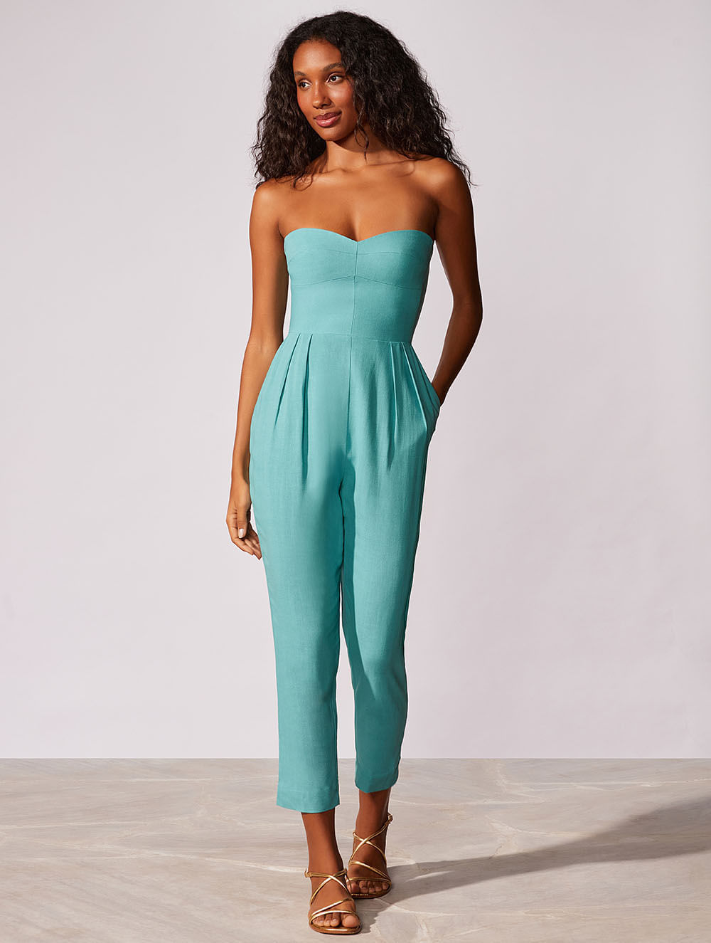 Macacão longo liso. O modelo possui decote reto com ombros descobertos, elástico nas costas com fecho de zíper invisível, bolsos laterais e detalhe de pregas.