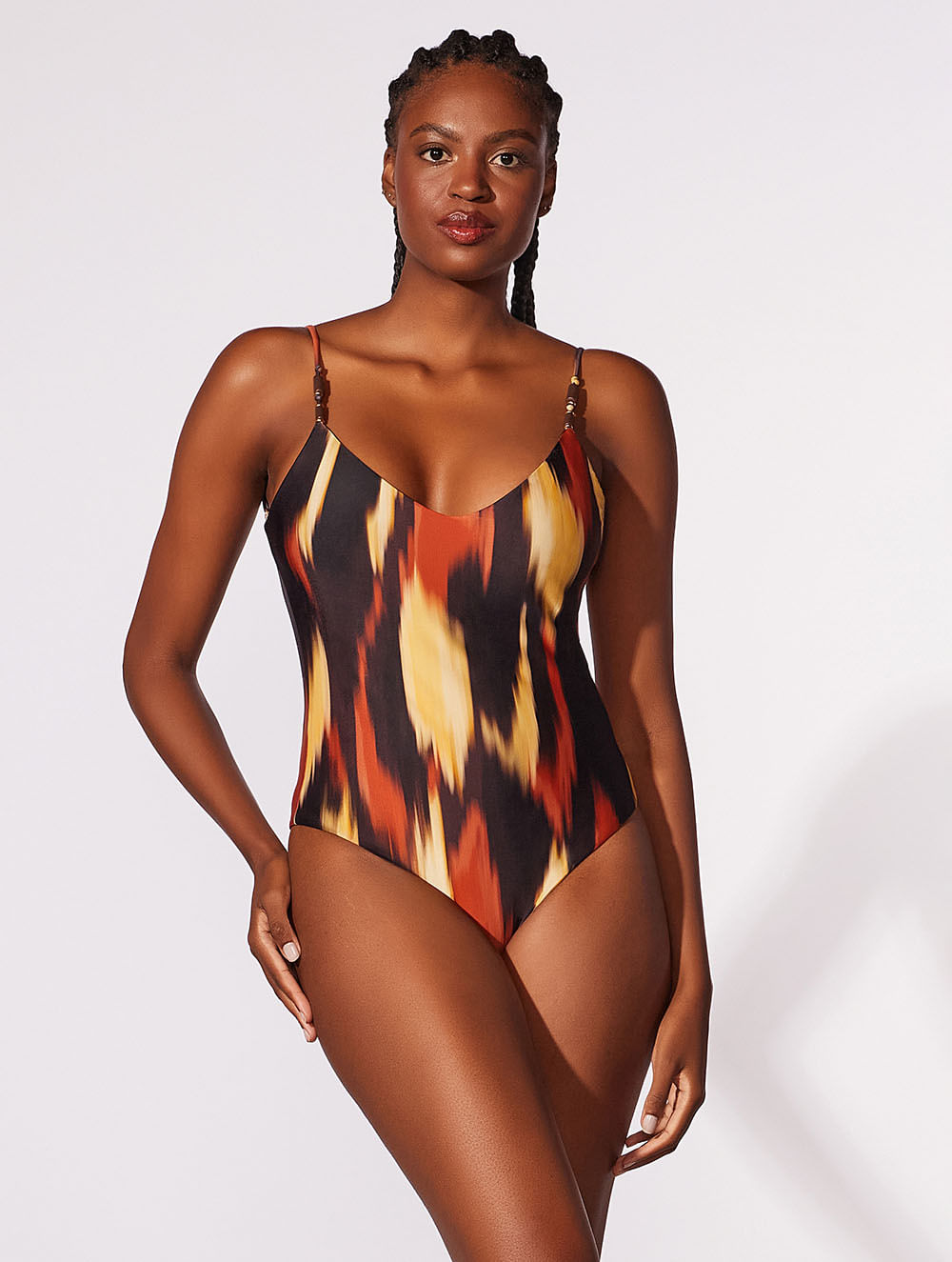 Maiô básico estampado. O modelo possui bojo removível, decote em V, alças com regulagem trabalhadas com detalhe de resina, argolas e nós handmade, e decote profundo nas costas.