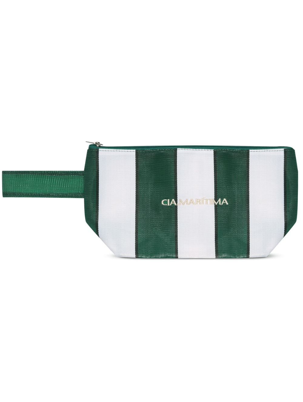 Nécessaire de tela. O modelo possui fechamento por zíper, alça lateral e detalhe de bordado com o nome da marca “Cia. Marítima’’.