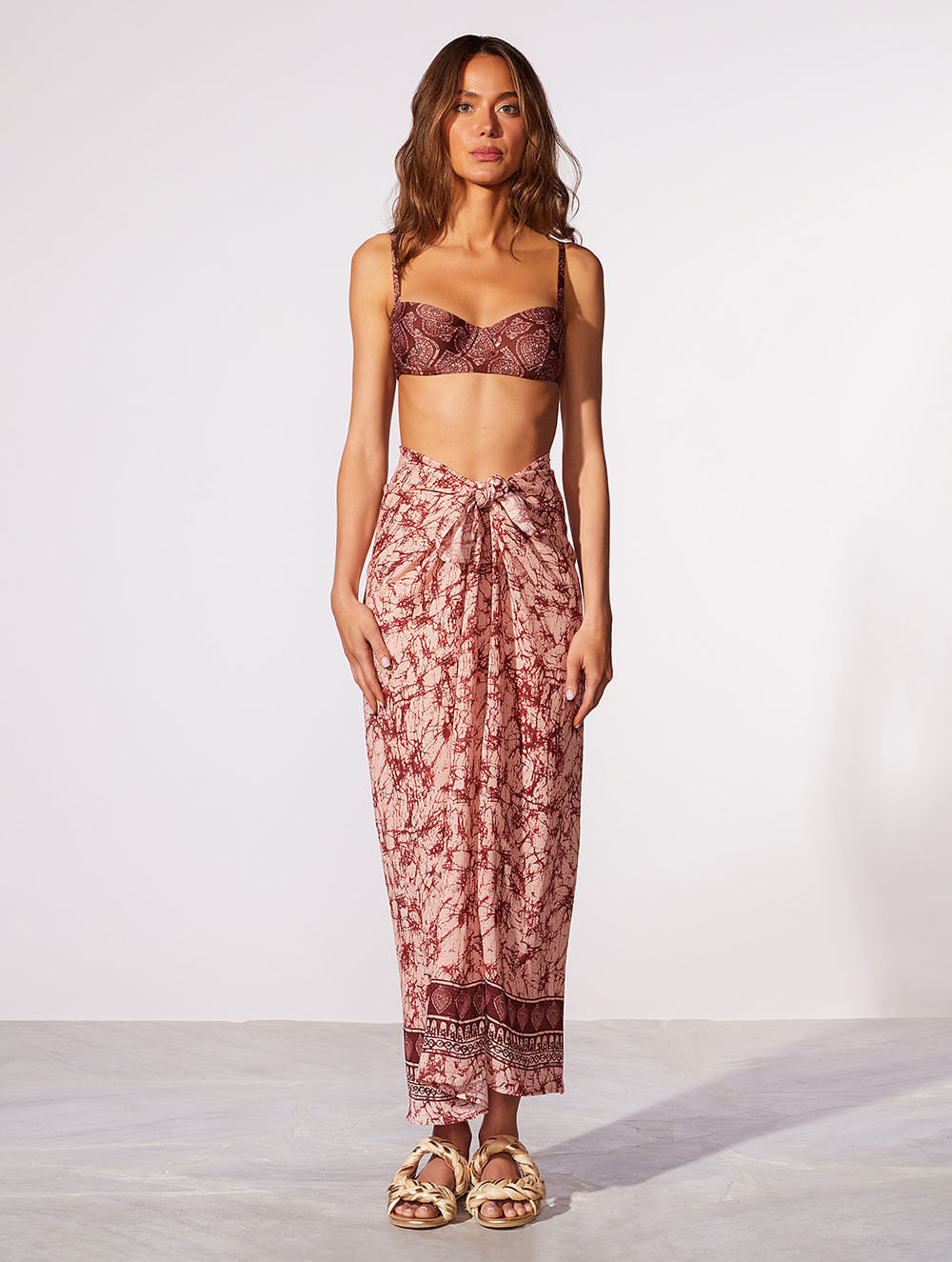 Pareô estampado. O modelo é trabalhado em tecido com fio de lurex, possui estampa localizada na barra, amarração na cintura e fenda frontal.
