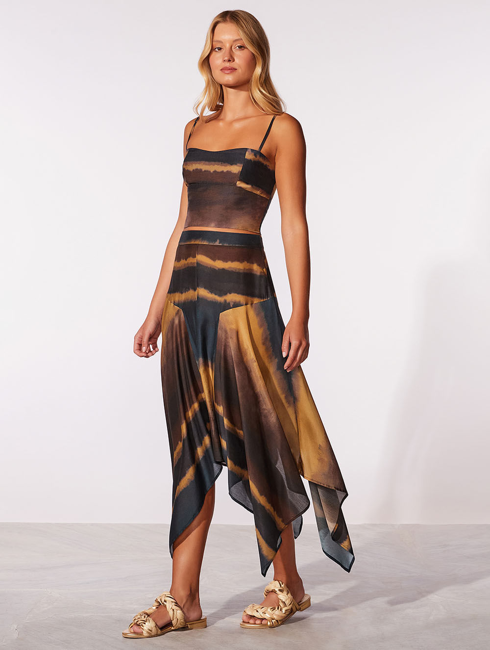 Saia midi estampada. O modelo possui barra assimetrica de detalhes de recortes.