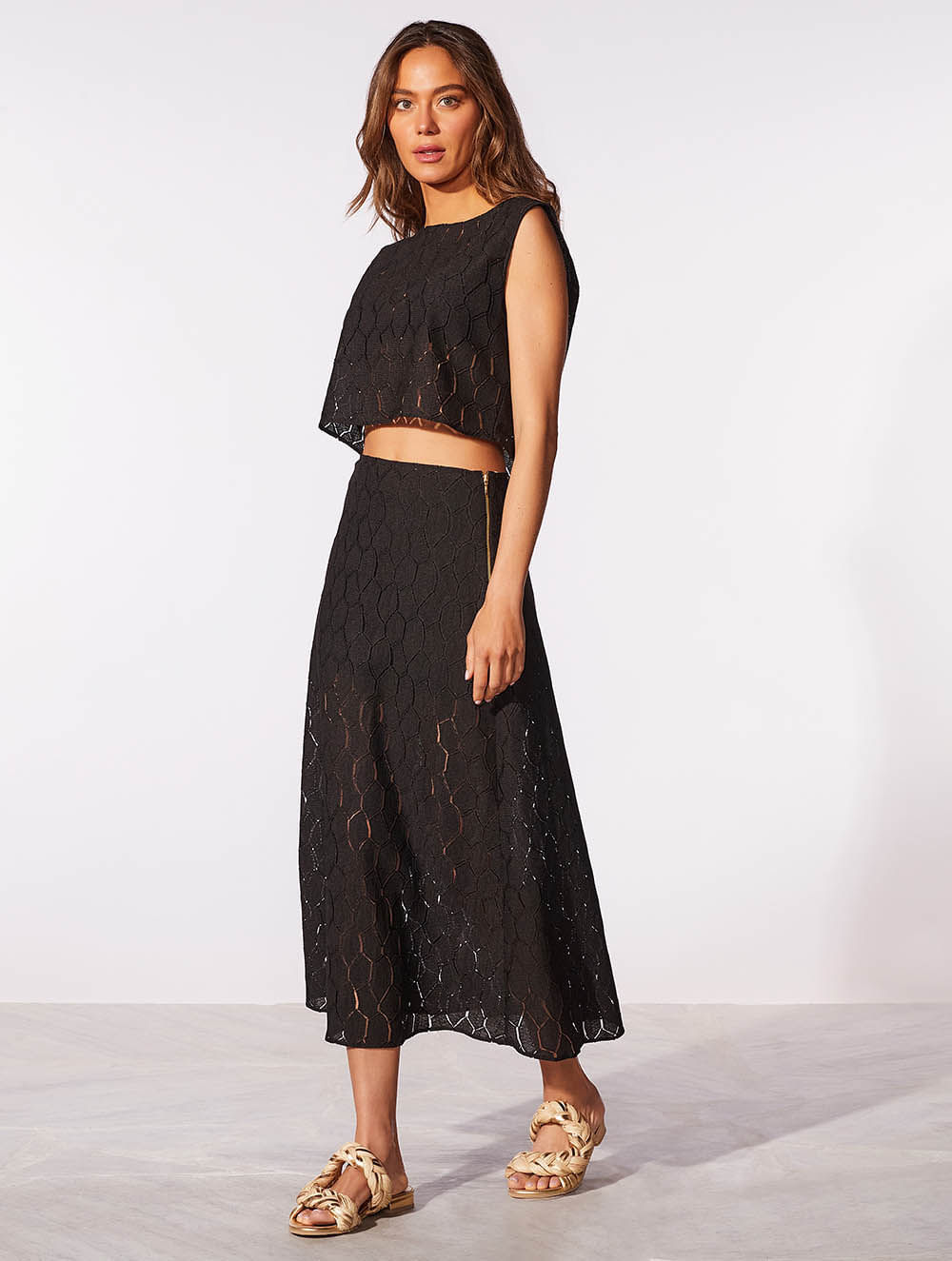 Saia midi lisa. O modelo é trabalhado em tecido de malha com textura, possui zíper lateral. Peça com transparência.