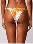 Tanga amarradinha estampada. O modelo possui cobertura pequena e laterais finas ajustáveis com ponteiras de metal no banho dourado.