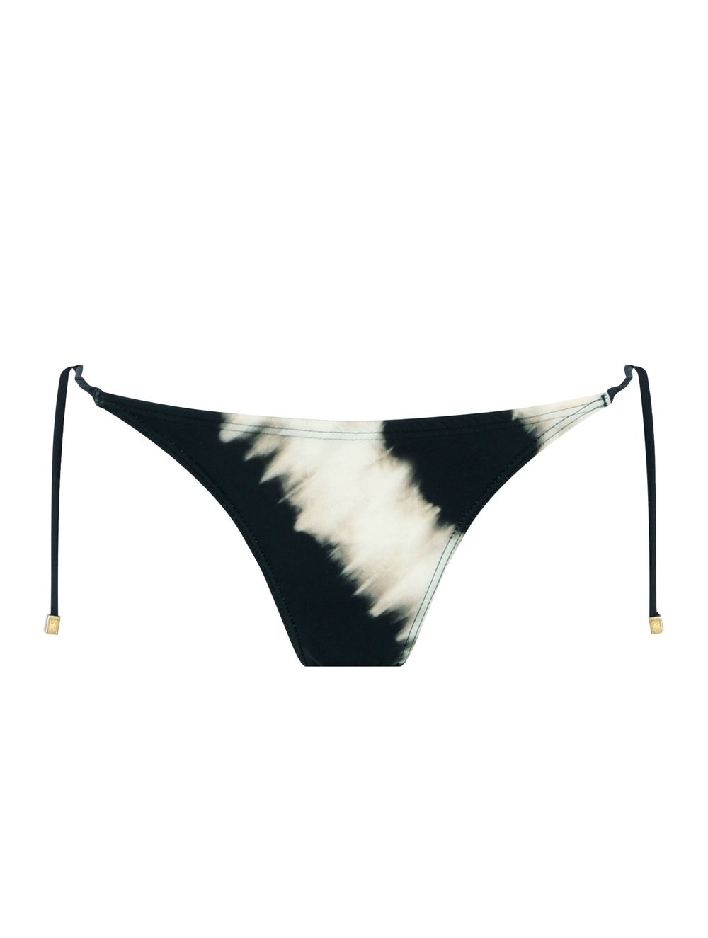 Tanga amarradinha estampada. O modelo possui um leve franzido nas costas, laterais finas ajustáveis com ponteiras de metais em banho Ouro Velho.