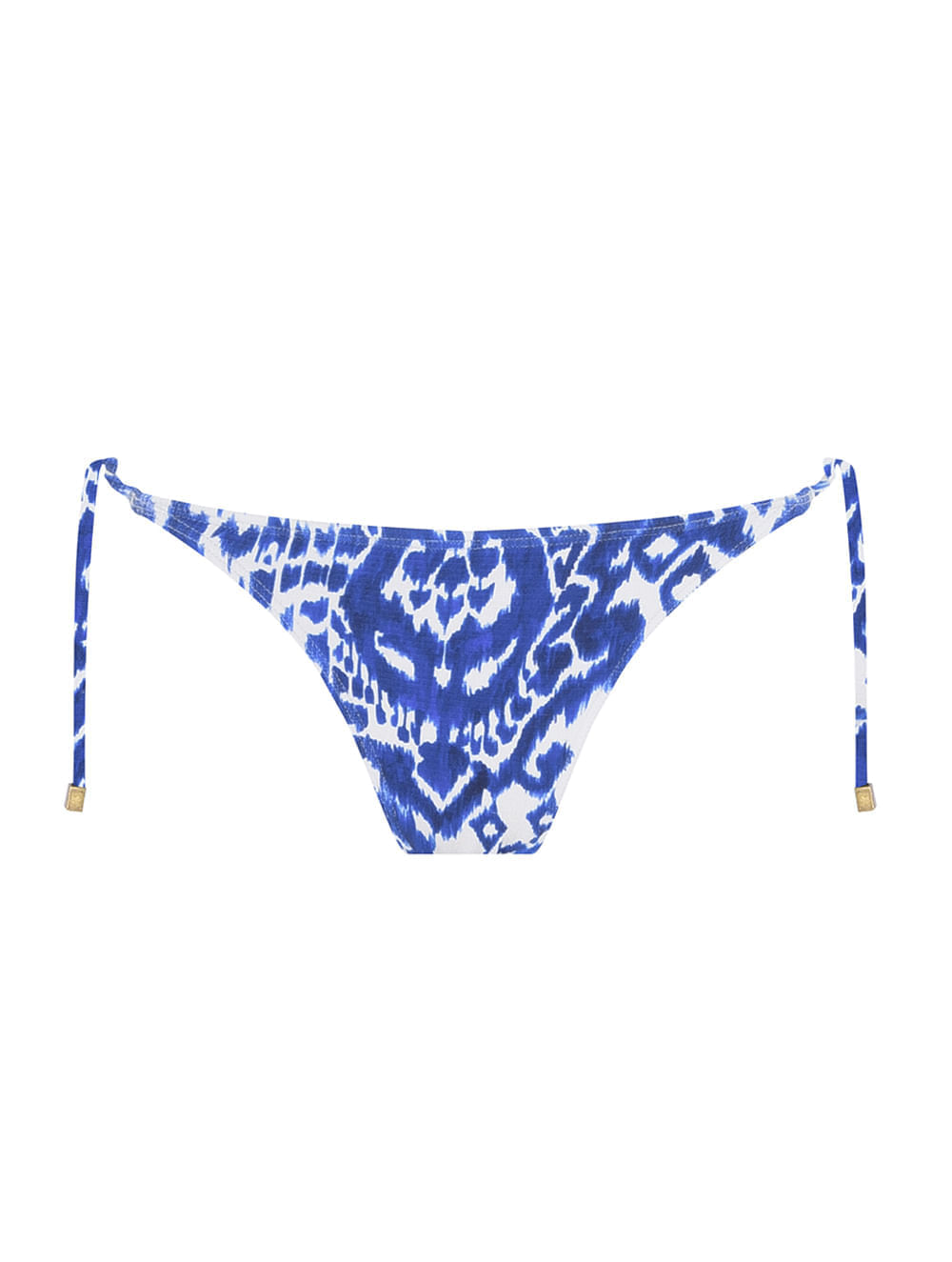 Tanga amarradinha estampada. O modelo é trabalhado em tecido com textura, possui cobertura pequena e laterais finas ajustáveis com ponteiras de metal no banho de Ouro Velho.