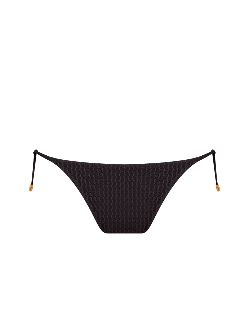 Tanga amarradinha lisa. O modelo é trabalhado em tecido com textura, possui cobertura pequena e laterais finas ajustáveis com ponteiras de metal no banho de Ouro Fosco.