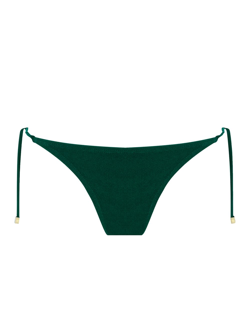 Tanga amarradinha lisa. O modelo possui cobertura pequena, leve franzido nas costas e laterais finas ajustáveis com ponteiras de metal no banho de Ouro Fosco.