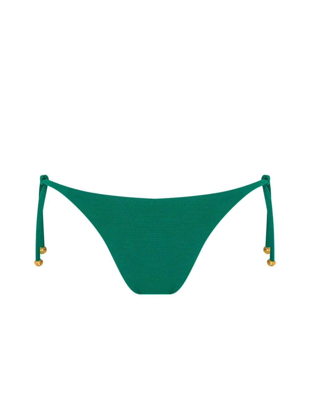 Tanga amarradinha lisa. O modelo é trabalhado em tecido com textura, possui cobertura pequena, acabamento embutido e laterais ajustáveis com ponteiras de metal no banho de Ouro Fosco.