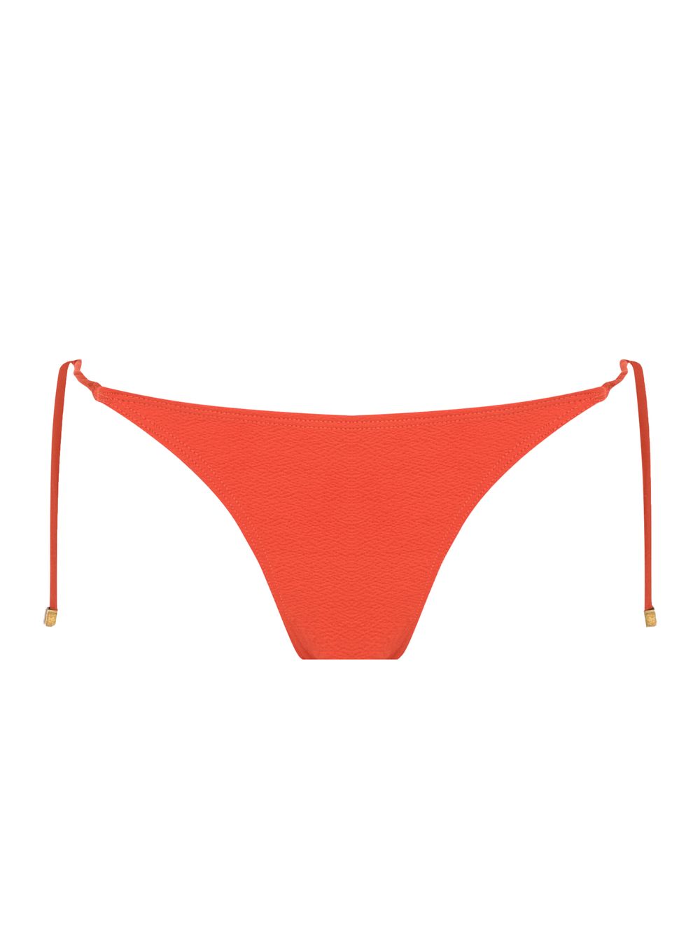 Tanga amarradinha lisa. O modelo possui cobertura pequena, laterais finas ajustáveis com ponteiras de metais no banho Ouro Velho, possui um leve franzido nas costas.