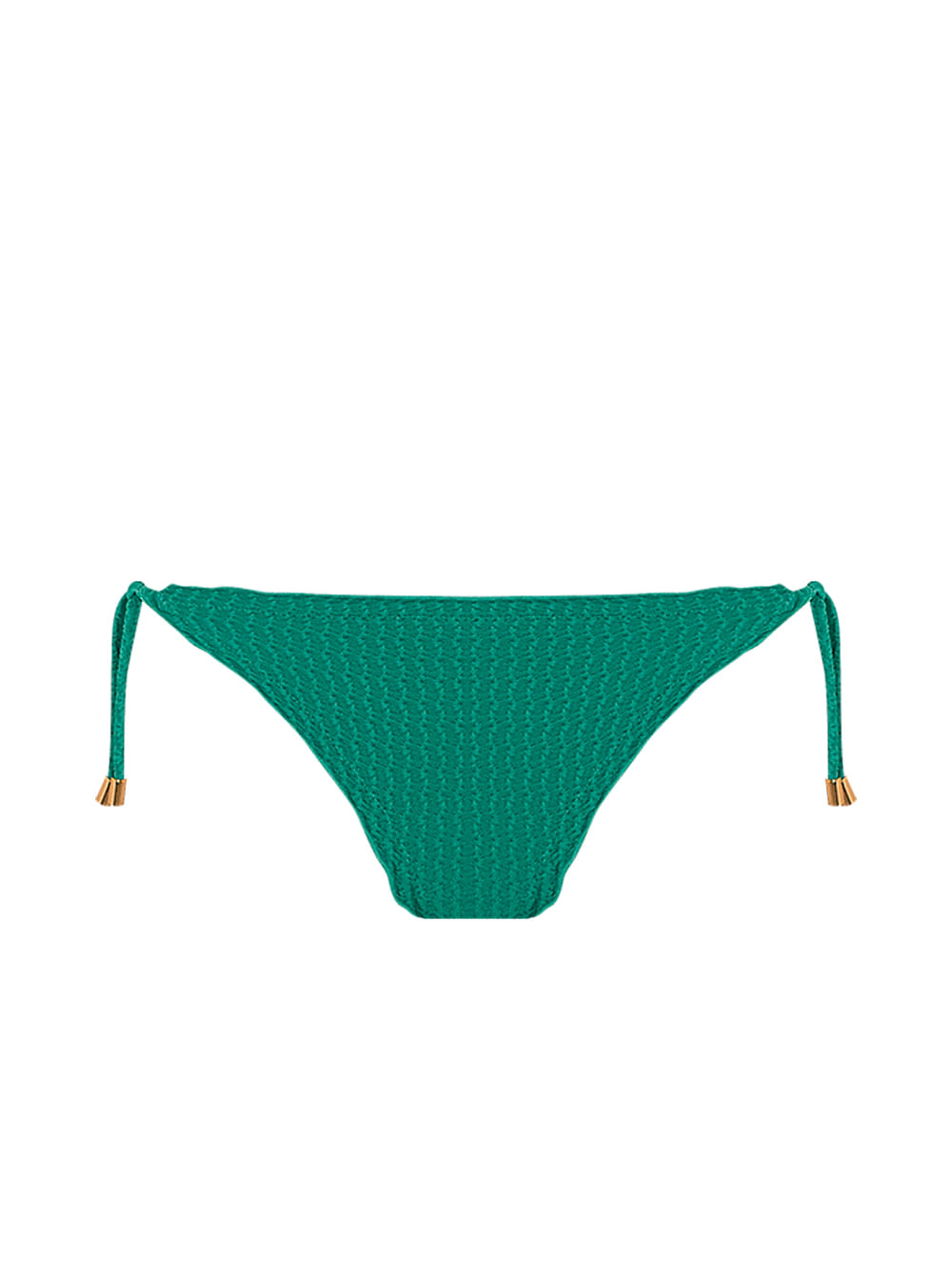 Tanga amarradinha lisa. O modelo é trabalhado em tecido com textura, possui cobertura pequena, leve franzido nas costas, acabamento ruffle, amarração lateral com detalhe de ponteiras e aviamentos de metal no banho de Ouro Fosco.