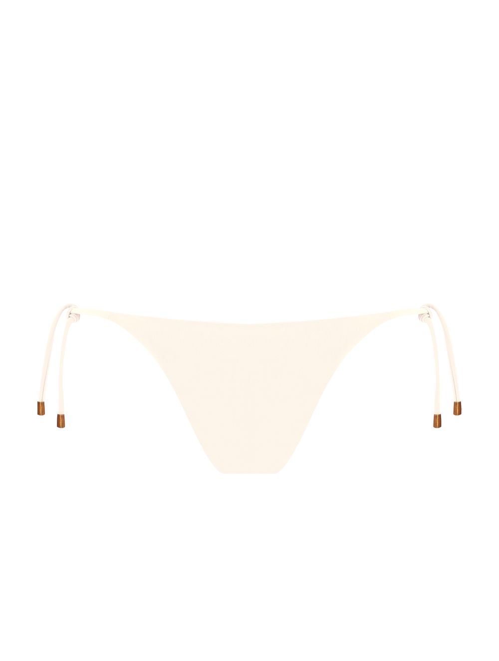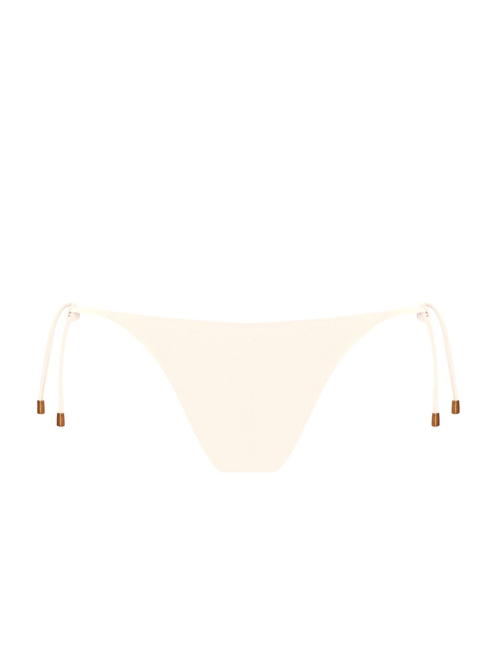 Tanga amarradinha lisa. O modelo possui cobertura pequena e laterais finas ajustáveis com ponteiras de metal no banho de Ouro Velho.