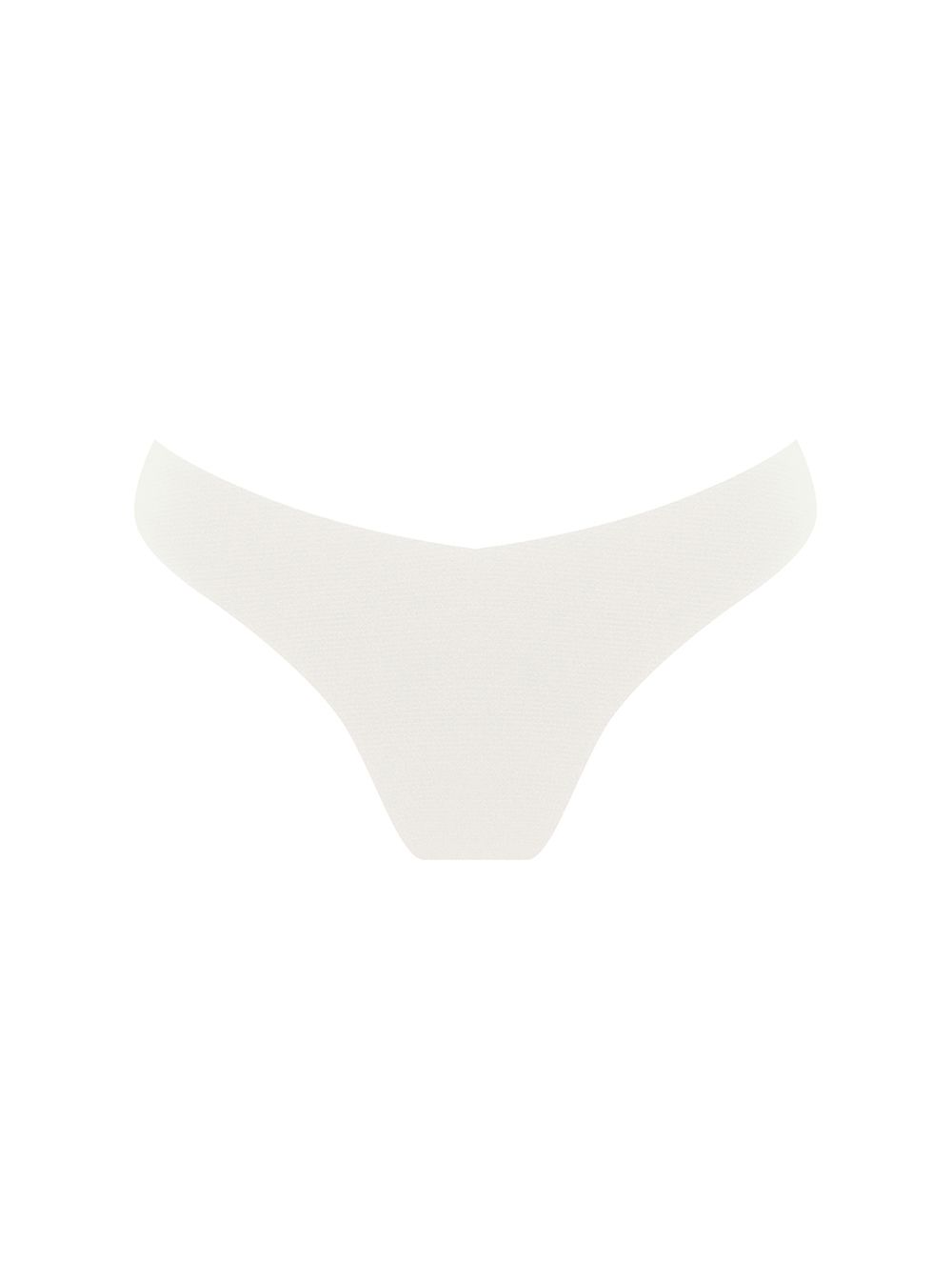 Tanga fio duplo. O modelo é trabalhado em tecido com textura, possui cava alta, cobertura pequena e recorte central nas costas com detalhe de logo no banho de Ouro Velho.