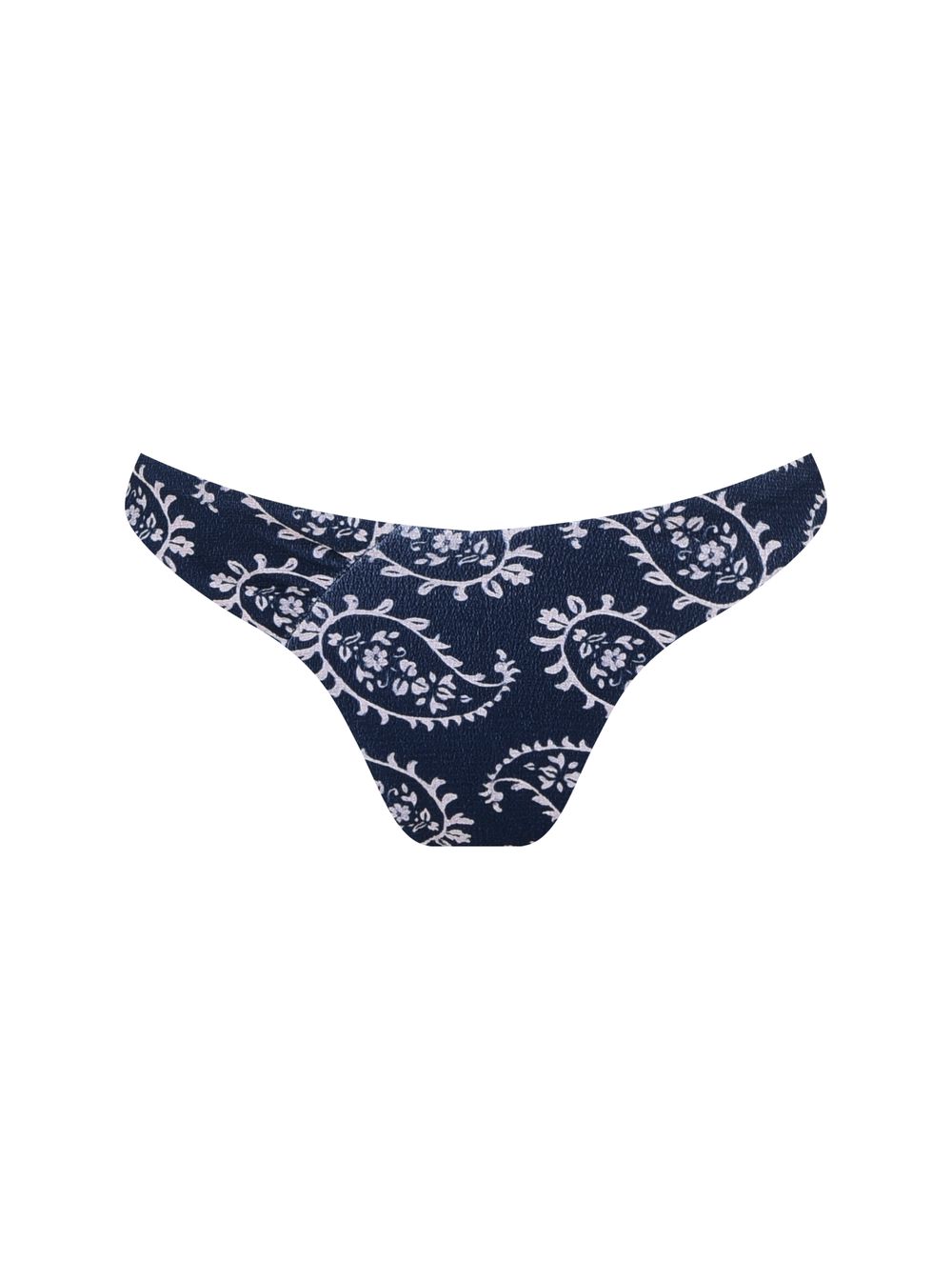 Tanga fio duplo estampada. O modelo é trabalhado em tecido com textura, possui cava alta, cobertura pequena e detalhe de recorte lateral com franzido.