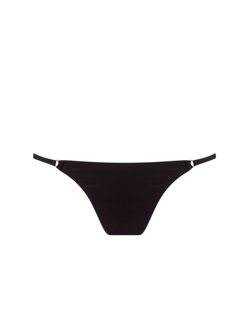 Tanga lateral estreita lisa. O modelo possui cobertura pequena, acabamento embutido, regulagem nas laterais e detalhes de metal no banho de Ouro Fosco.