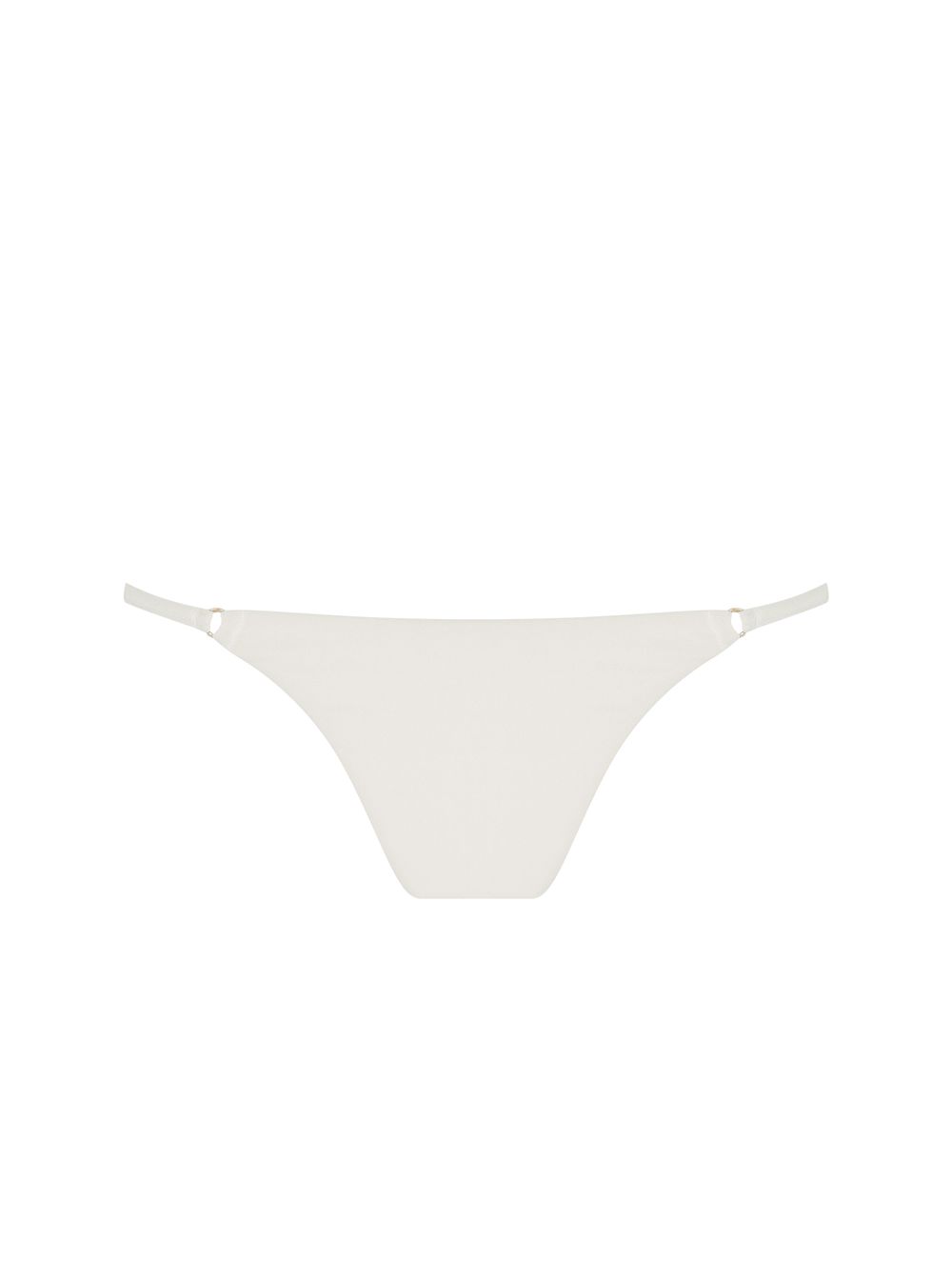 Tanga lateral estreita lisa. O modelo possui cobertura pequena, acabamento embutido, regulagem nas laterais e detalhes de metal no banho de Ouro Fosco.