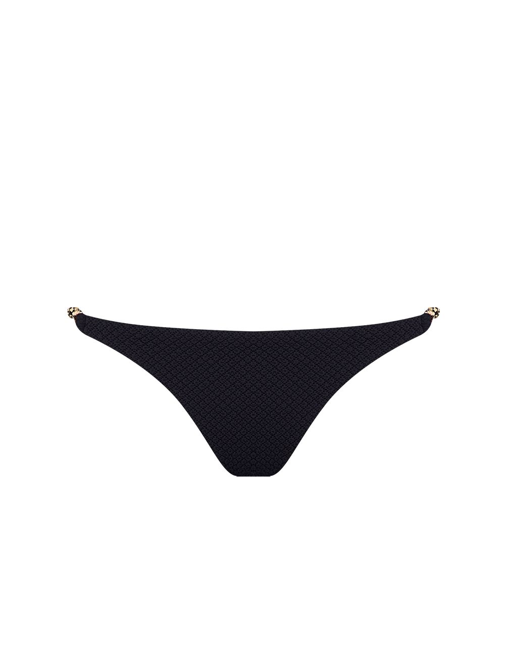 Tanga lateral estreita. O modelo é trabalhado em tecido com textura, possui cobertura pequena e laterais trabalhadas em cordão, madrepérola e metal no banho de Ouro Fosco.