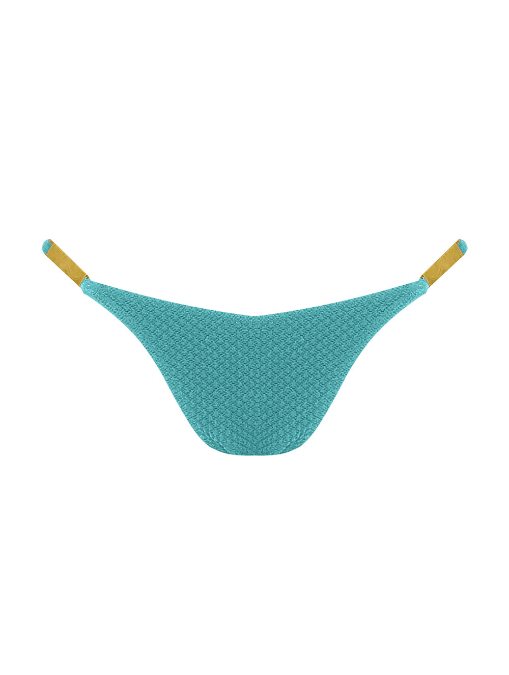 Tanga lateral estreita. O modelo é trabalhado em tecido com textura, possui cobertura pequena e laterais trabalhadas com placa de metal no banho dourado.
