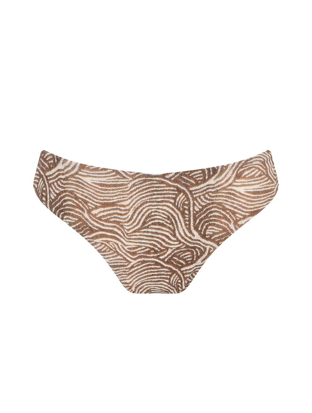Tanga lateral média estampada. Modelo básico, com detalhe de metal nas costas em banho Ouro Velho.
