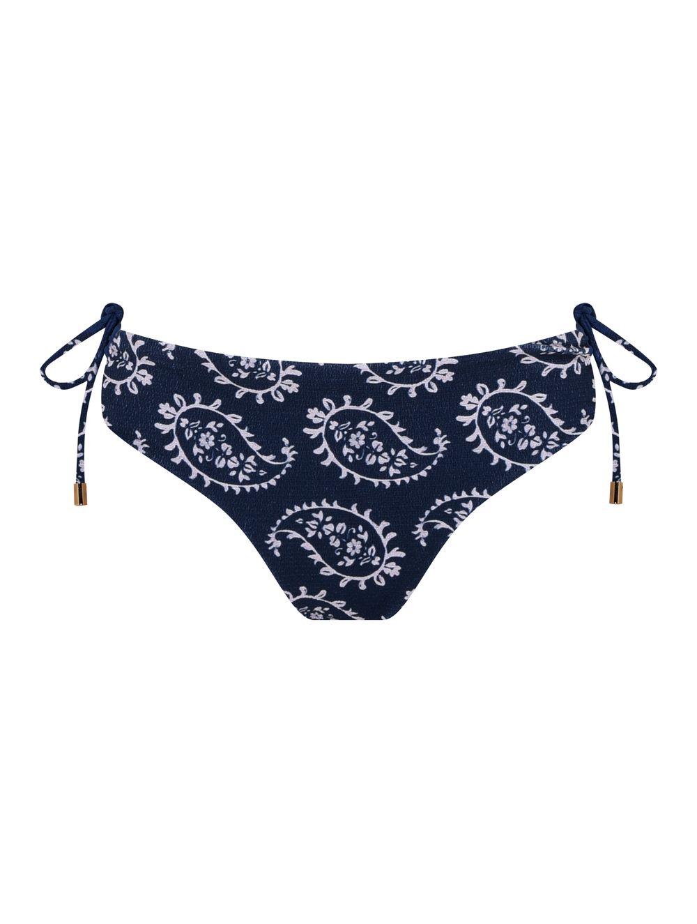 Tanga lateral média estampada. O modelo é trabalhado em tecido com textura, possui acabamento embutido e canaletas ajustáveis nas laterais com ponteiras de metal no banho de Ouro Fosco.
