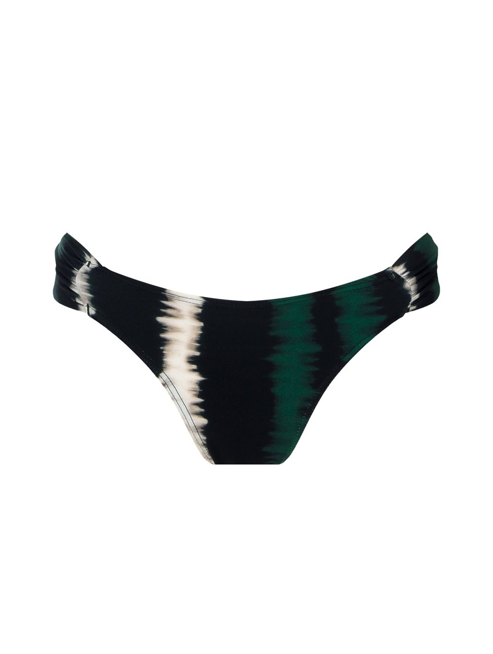Tanga lateral média estampada. O modelo possui recortes laterais por meio de tecidos duplos drapeados. Aviamento de metal nas costas em banho de Ouro Velho.