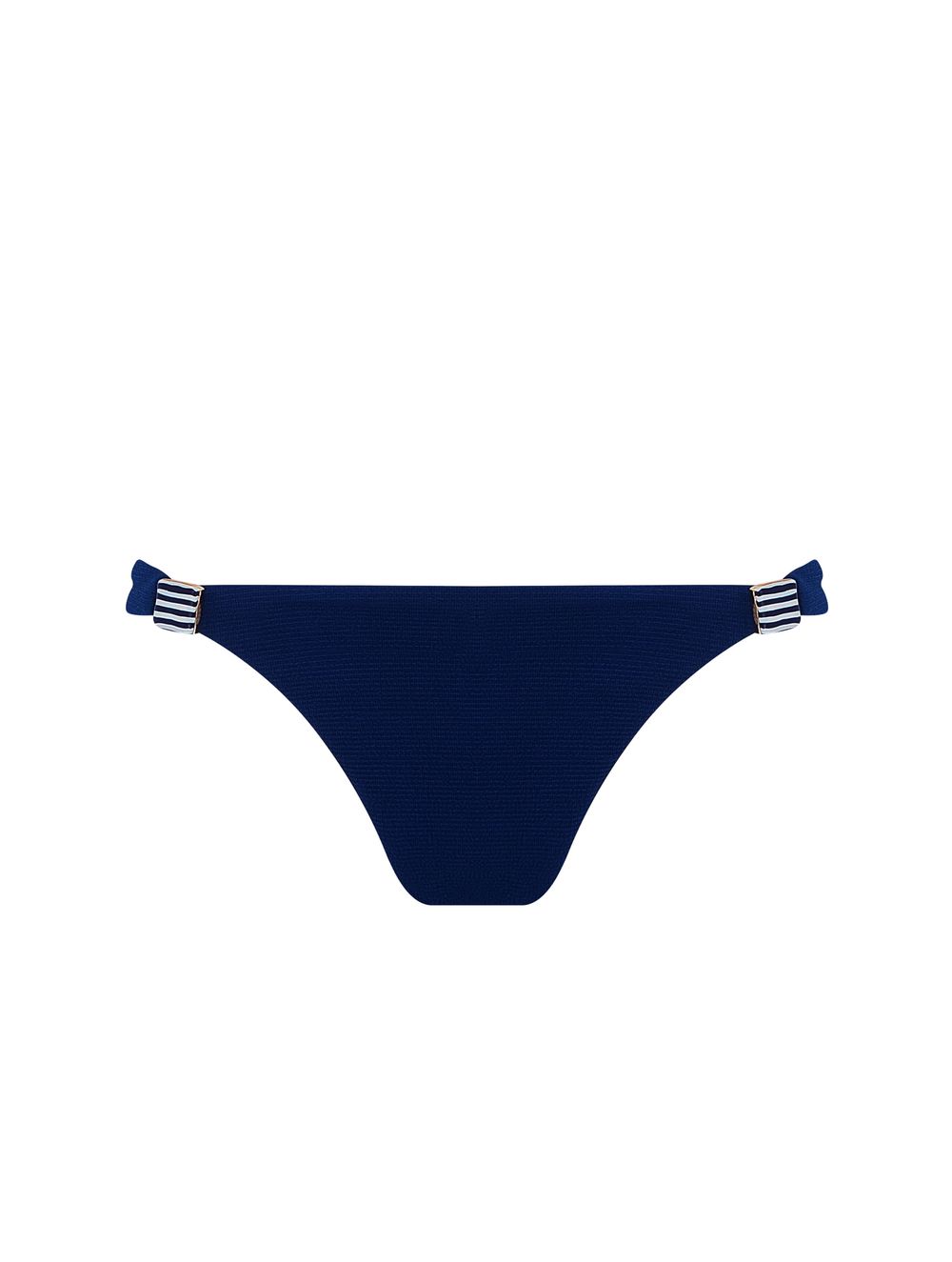 Tanga lateral média. O modelo é trabalhado em tecido com textura e possui detalhe de passante nas laterais estilo navy.