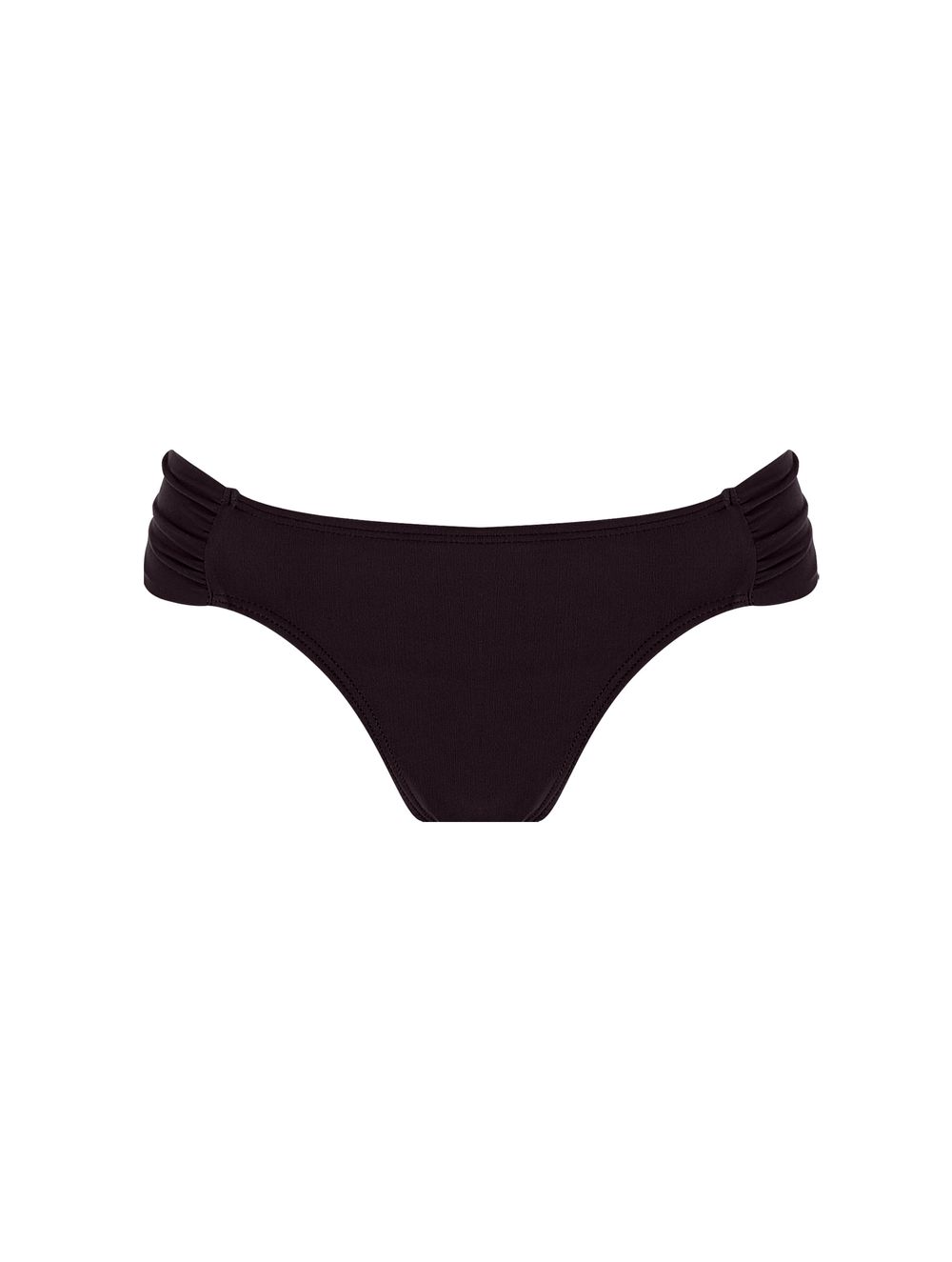 Tanga lateral média lisa. O modelo possui recortes laterais franzidos em tecidos duplos drapeados e aviamento de metal no banho de Ouro Velho nas costas.