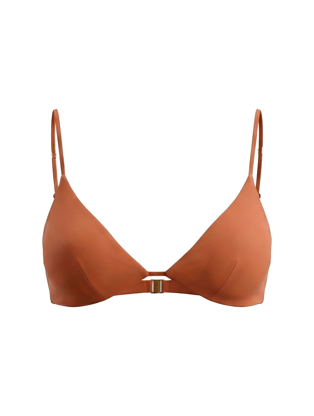 Top triângulo liso. O modelo possui alças fixas reguláveis, fecho de ímã e bojo removível com modelagem pequena e de pouca sustentação, ideal para bustos pequenos e médios.