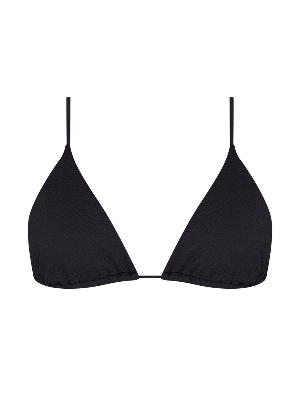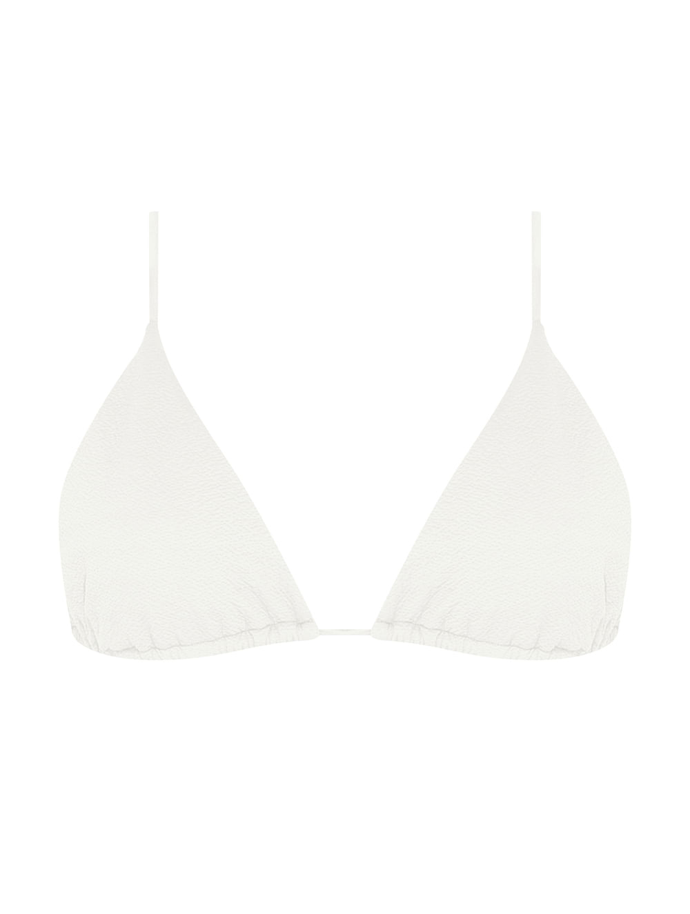 Top cortininha. O modelo é trabalhado em tecido com textura, possui bojo removível e alças finas para amarração no pescoço ou nas costas.