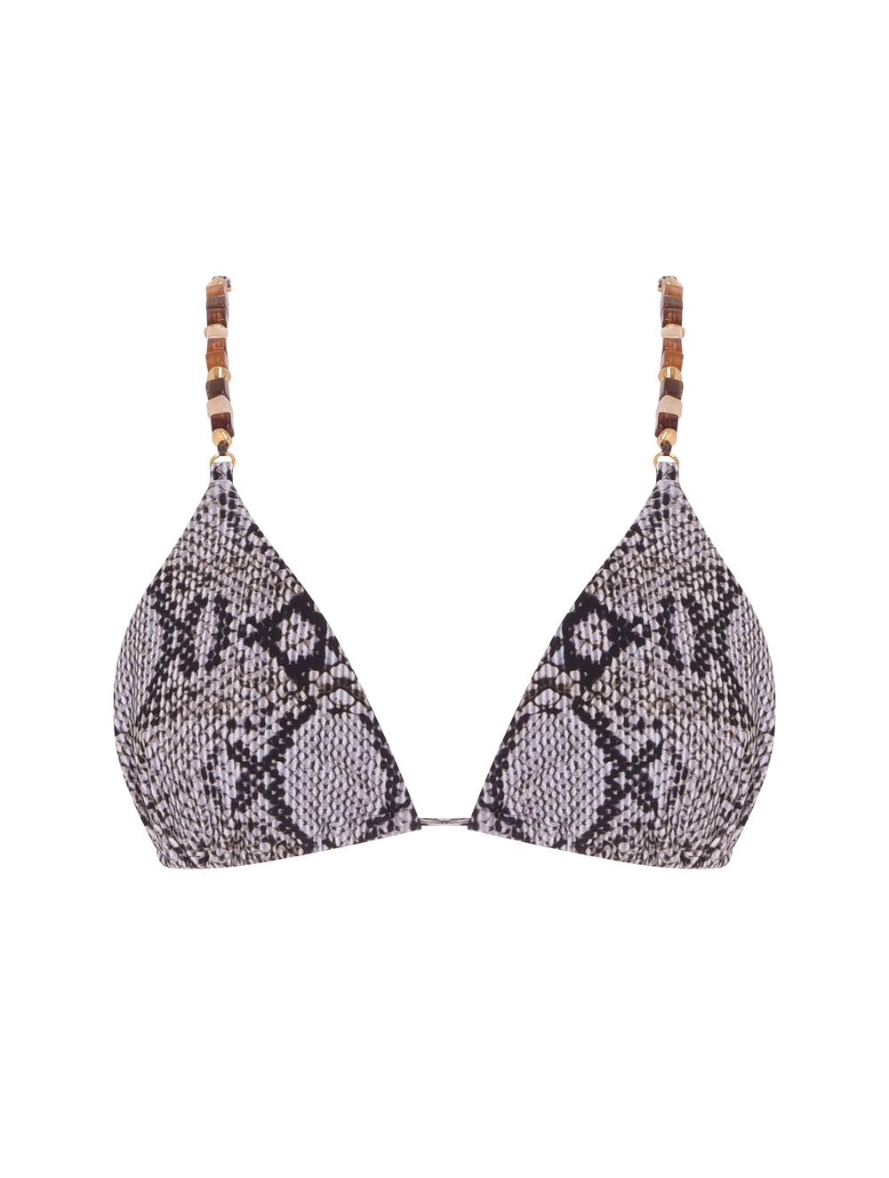 Top cortininha estampado. O modelo possui bojo removível, alças fixas trabalhadas com detalhe de Metal e regulagem no banho Ouro Fosco.