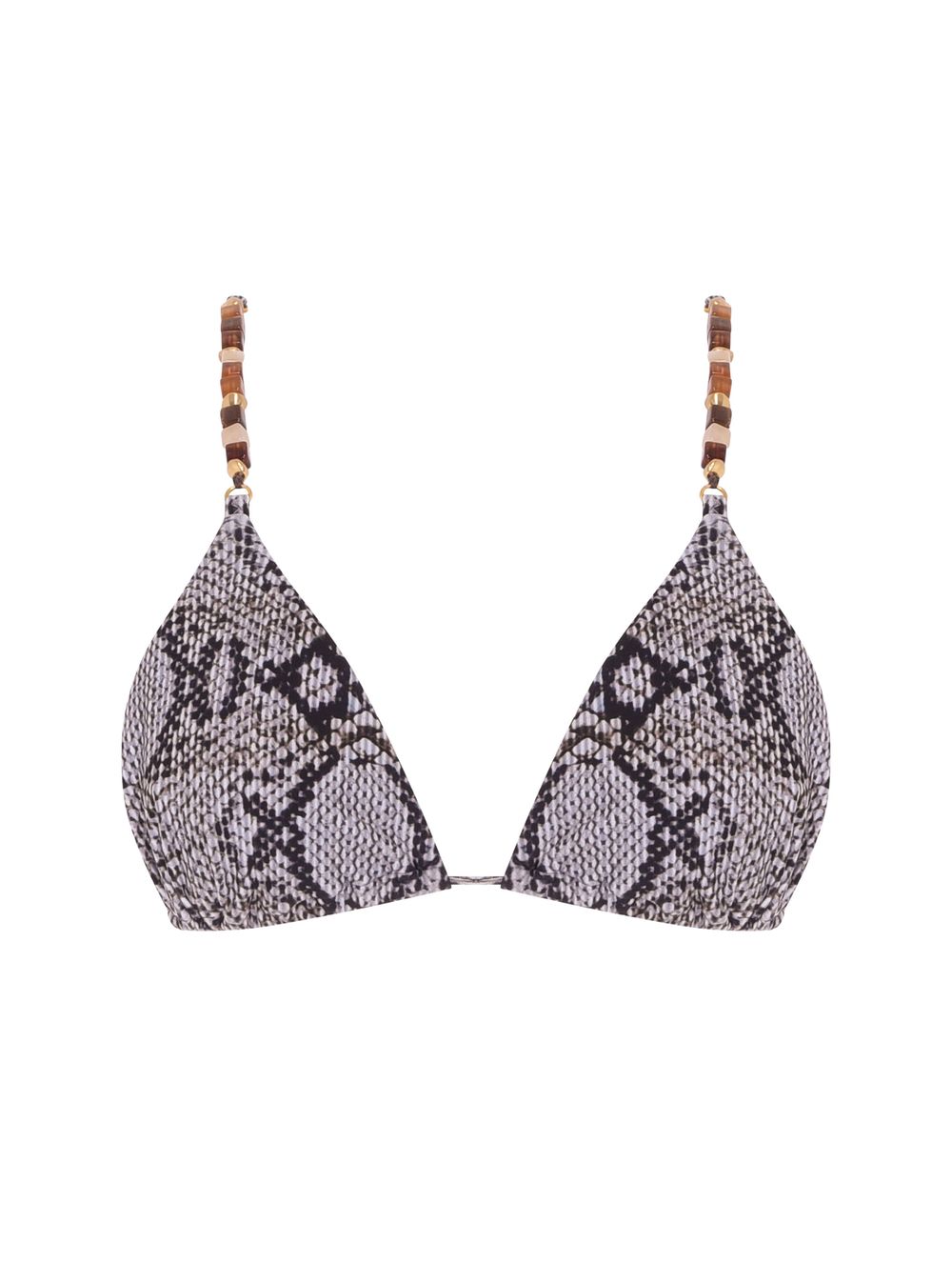 Top cortininha estampado. O modelo possui bojo removível, alças fixas com regulagem trabalhadas em pedras naturais e detalhes de metal no banho de Ouro Fosco. Um modelo super sofisticado graças às suas alças feitas de pedras naturais e o banho a ouro.