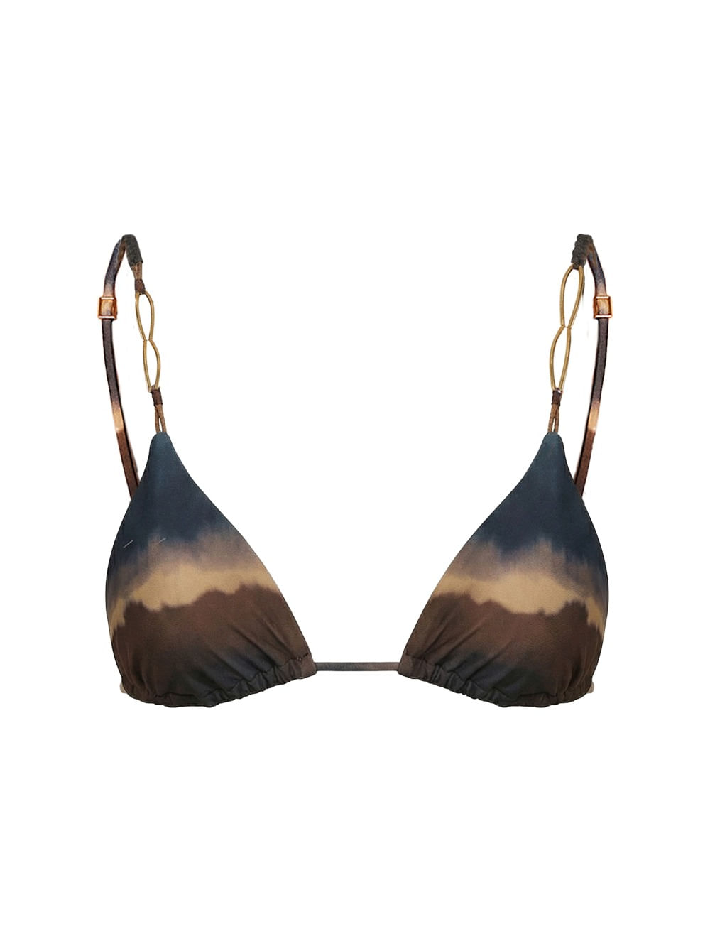 Top cortininha estampado. O modelo possui bojo removível, alças fixas trabalhadas com detalhe de Metal e regulagem no banho Ouro Fosco.