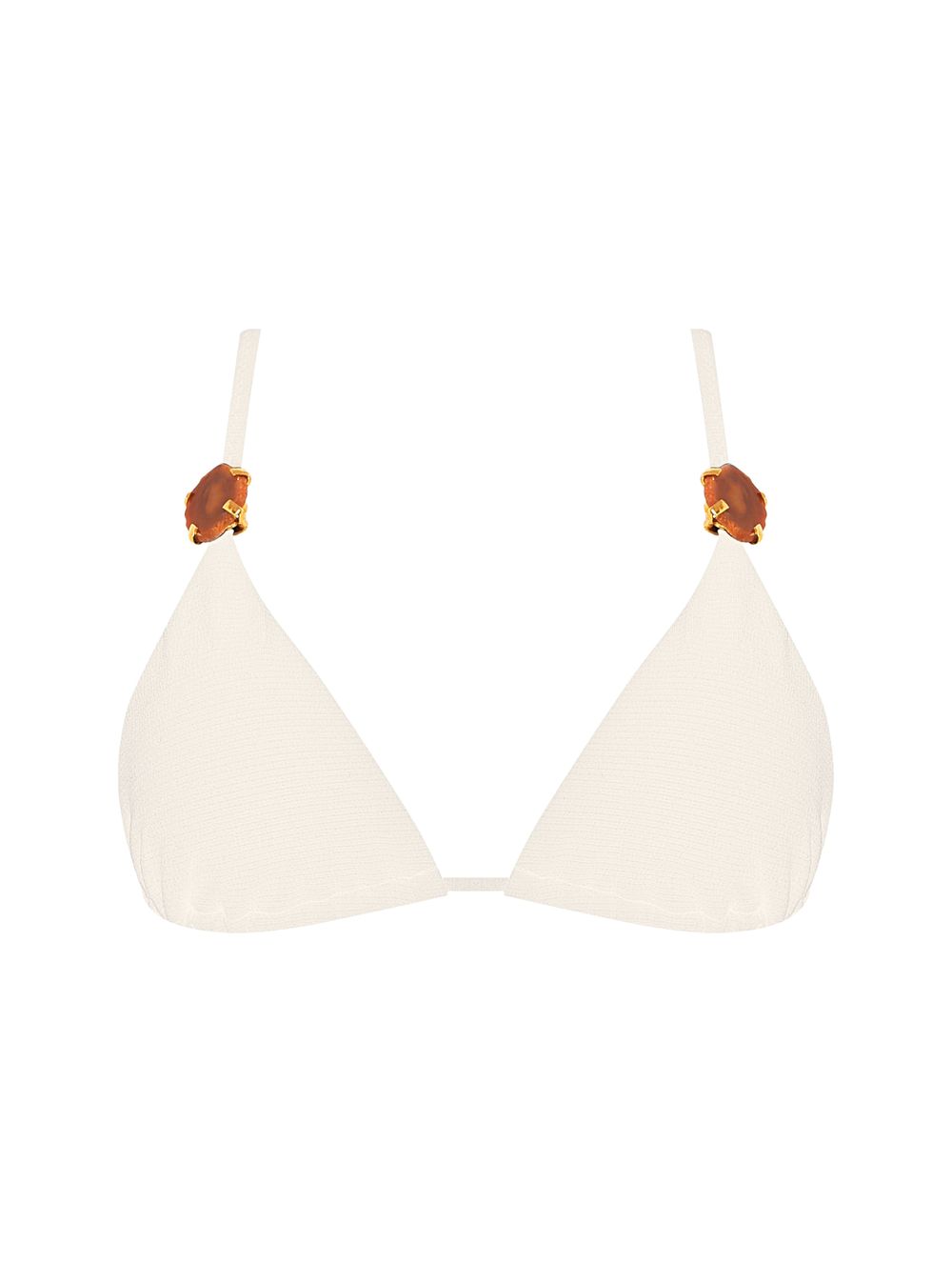 Top cortininha liso. O modelo é trabalhado em tecido com textura, possui bojo removível, alças fixas com regulagem trabalhadas com detalhe de pedra natural e garras metálicas no banho de Ouro Light.