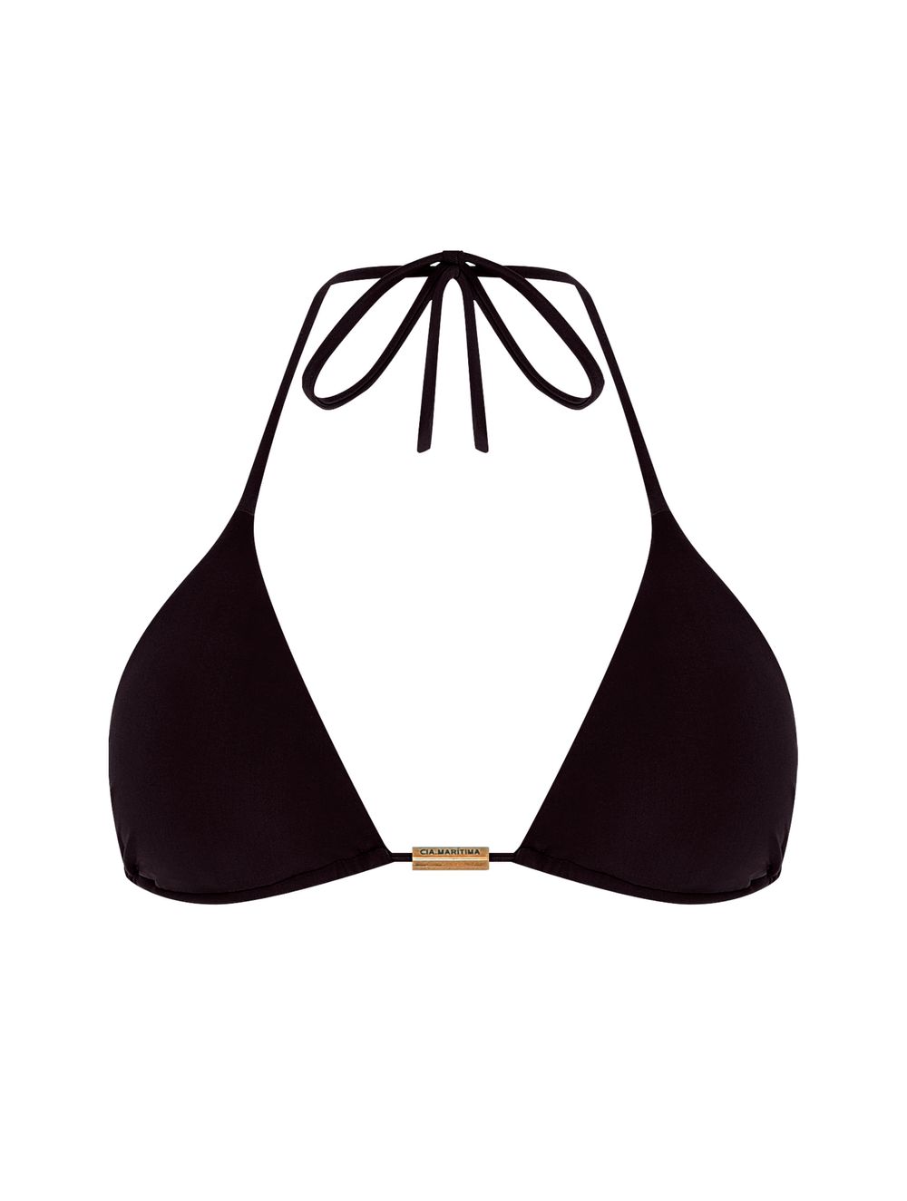 Top cortininha liso. O modelo possui bojo removível, detalhe de metal no banho de Ouro Velho com nome da marca gravado no centro do busto, e alças para amarração no pescoço ou nas costas.