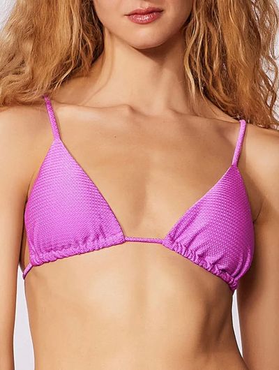Top cortininha liso. O modelo é trabalhado em tecido com textura, possui bojo removível, alças fixas com regulagem e aviamentos de metal no banho de Ouro Velho.