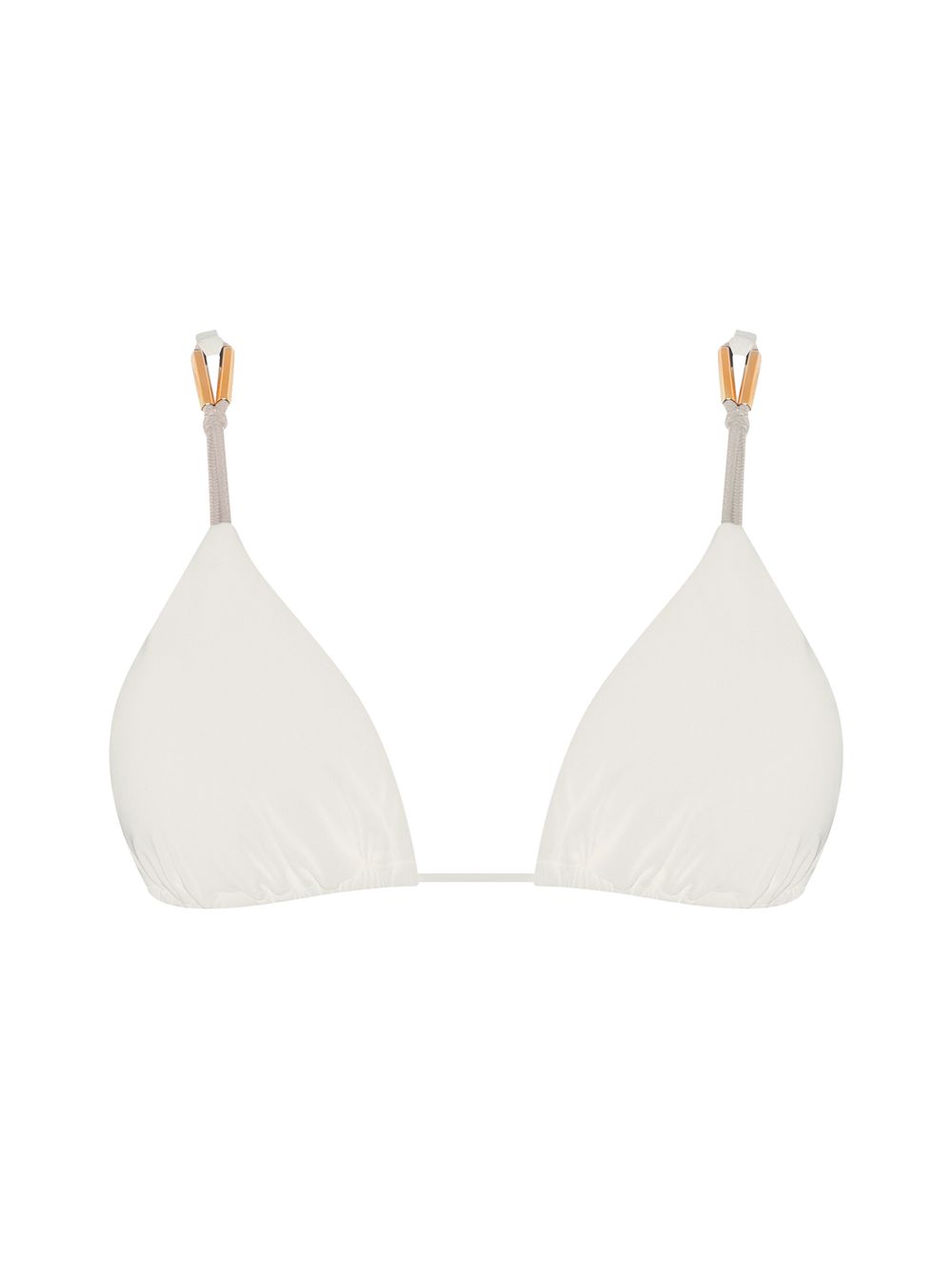 Top cortininha liso. O modelo possui bojo removível, alças fixas trabalhadas com regulagem, elástico e detalhe de metal no banho de Ouro Fosco.