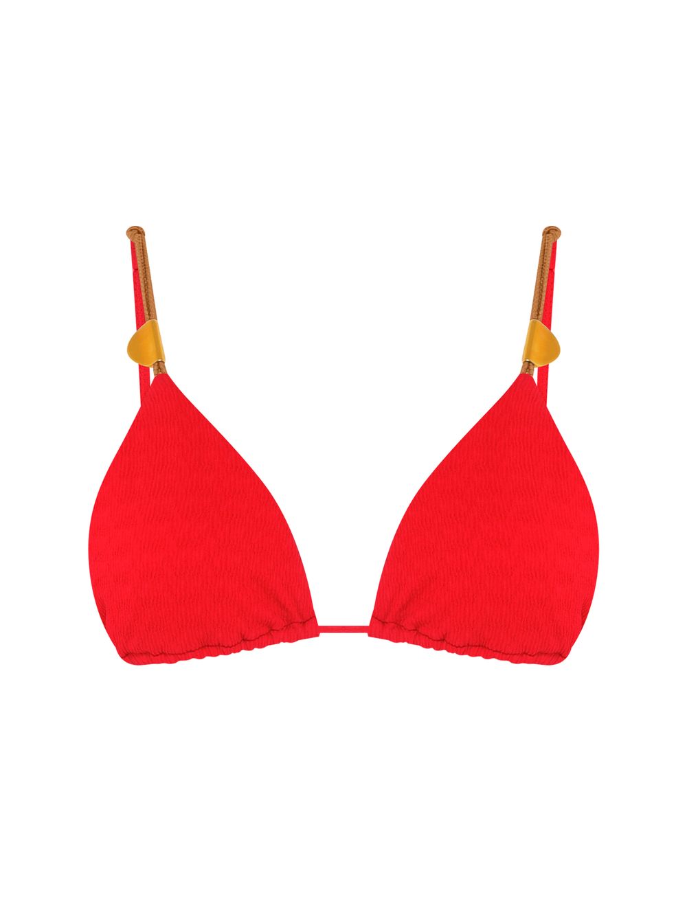 Top cortininha. O modelo é trabalhado em tecido com textura, possui bojo removível, alças fixas com regulagem trabalhadas com detalhe de elástico e metal no banho de Ouro Fosco.