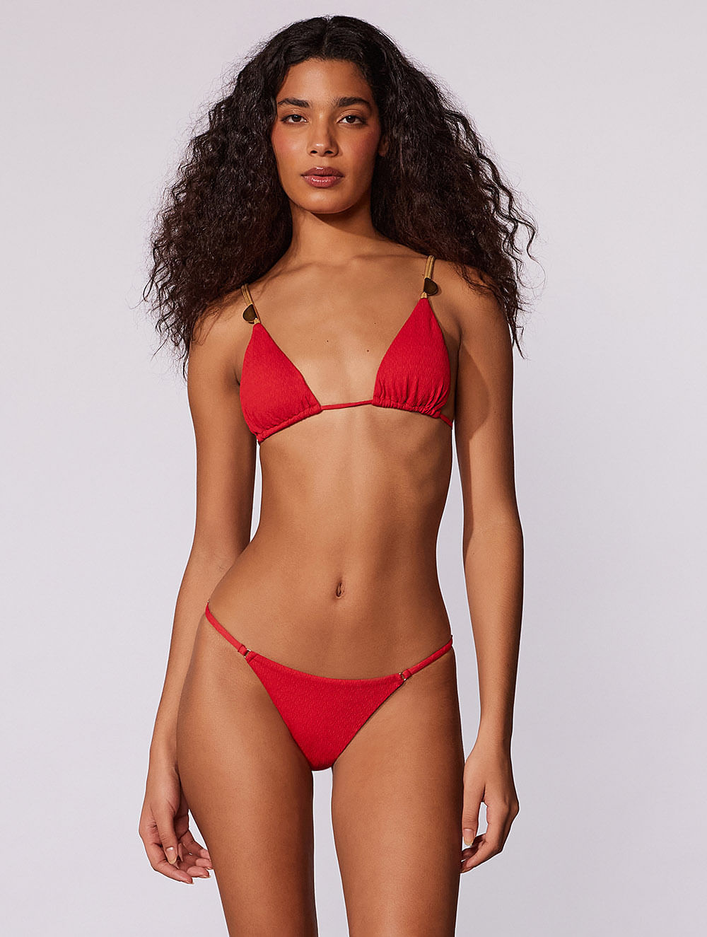 Tanga lateral estreita. O modelo é trabalhado em tecido com textura, possui cobertura pequena, acabmento embutido, regulagem nas laterais e detalhes de metal no banho de Ouro Fosco.